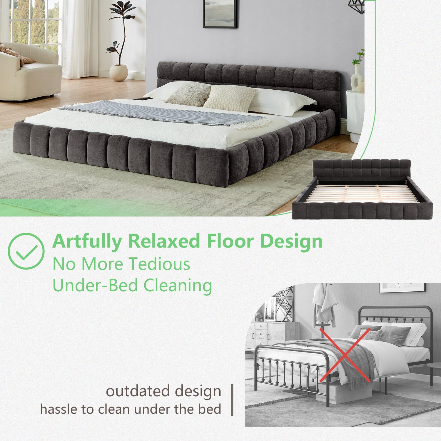 Olodumare King Grounded Bed Frame with Headboard, Cute Puff Grid Pattern Chenille Upholstered Platform Floor Bed with Sturdy Slats, No Box Spring Needed, Easy Assembly, Charcoal Grey