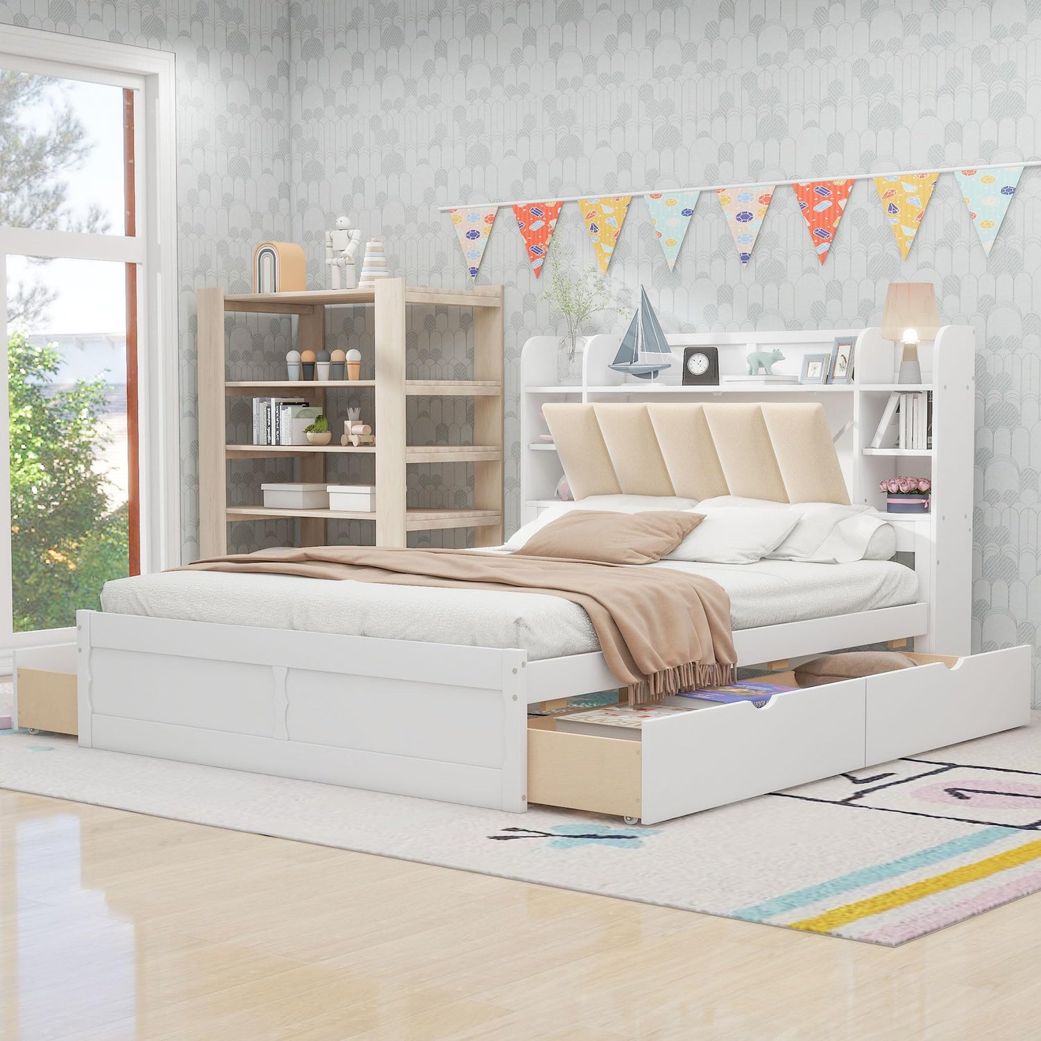 P PURLOVE Queen Storage Bed Frame with Upholstered Headboard, Shelves and 4 Drawers in White