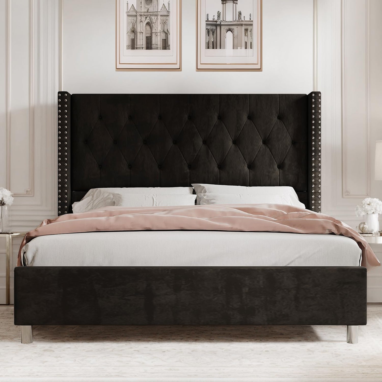 PaPaJet Upholstered Queen Bed Frame with Tall Headboard, Wingback Platform Bed, Low Profile Velvet Tufted Button, No Box Spring Needed, Easy Assembly, Black