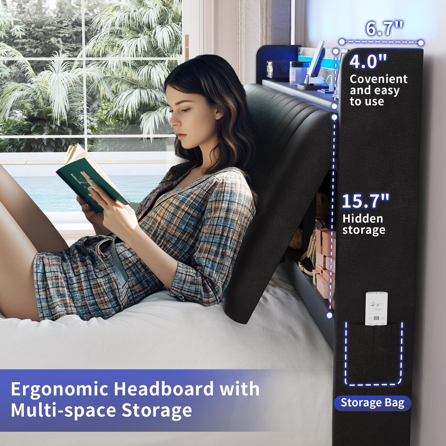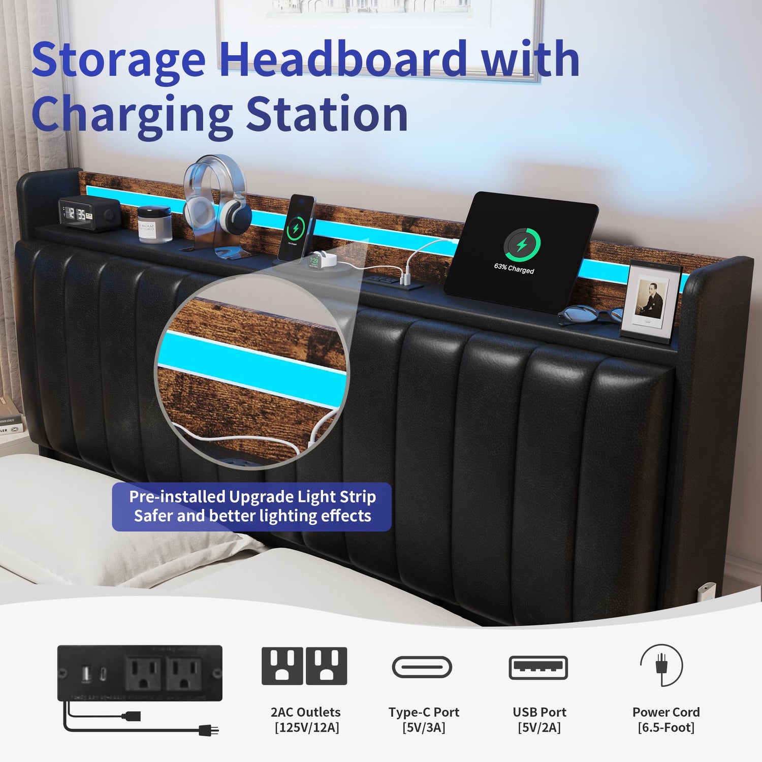 - STORAGE HEADBOARD WITH CHARGING STATION: Featuring 6.7'' deep open shelf and 15.7'' high large hidden private storage space, this Queen Bed Frame with Headboard keeps your essentials like books, phones and decorations neatly stored. The built-in charging station offers 2 standard outlets, 1 USB port and 1 Type-C port, making it easy to charge phones, tablets and other devices right at your bedside. Side storage pockets hold phones and remotes for easy access