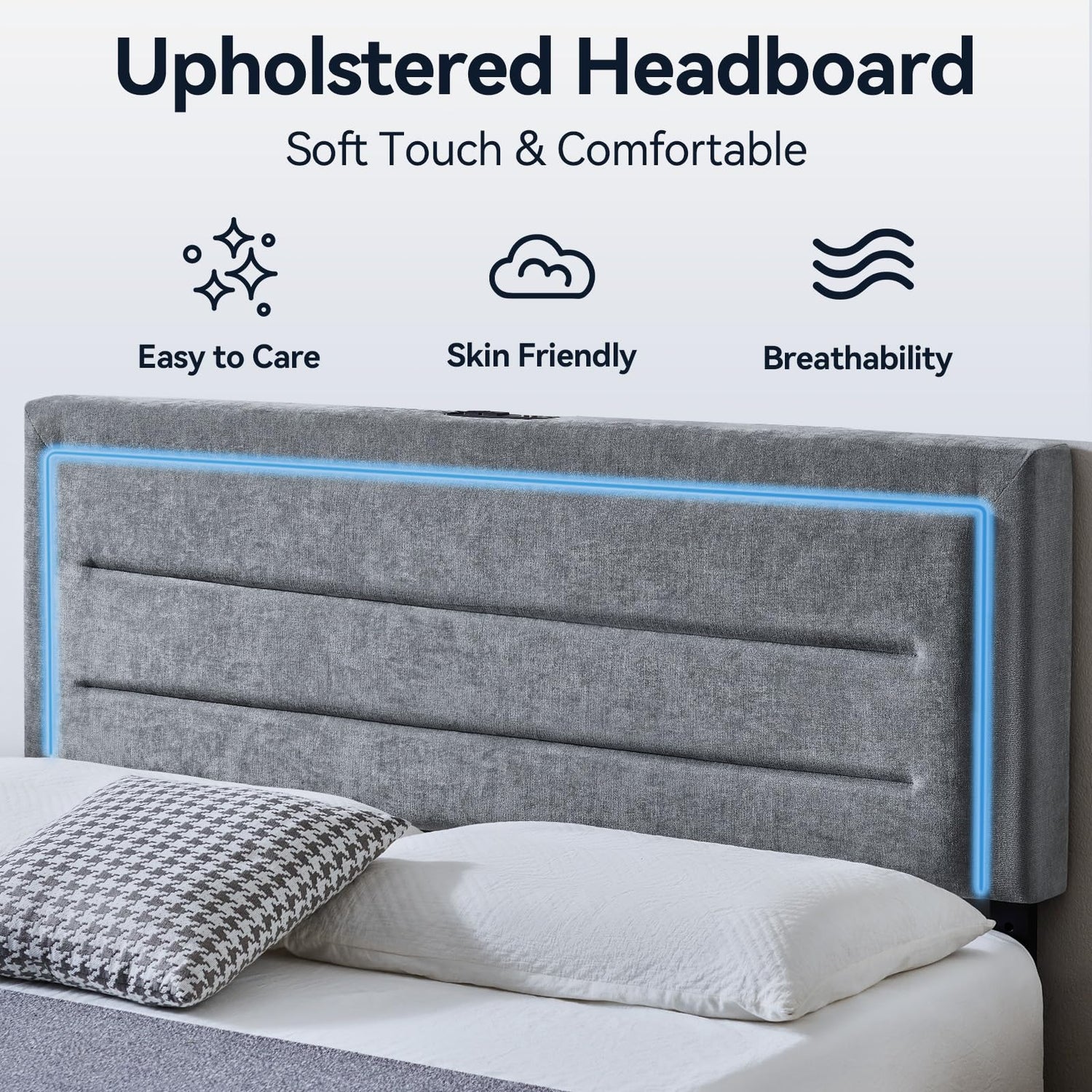 Queen Size Bed Frame with LED Lights and Charging Station, Chenille Upholstered Platform Queen Bed Frame with Headboard, No Box Spring Needed Bedframe, Noise Free, Easy Assembly, Gray