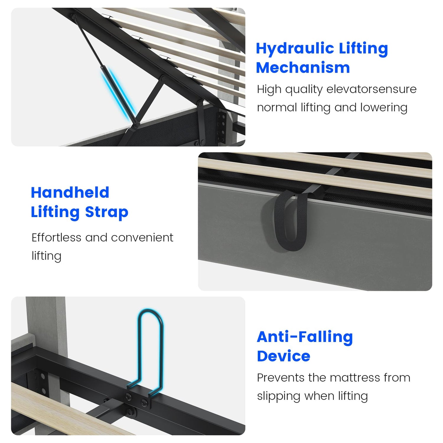 Safety and stability are paramount. With the added safety buckle and handle mechanism, lifting the bed frame is a breeze, with the buckle ensuring that everything remains secure, preventing any unexpected movements.