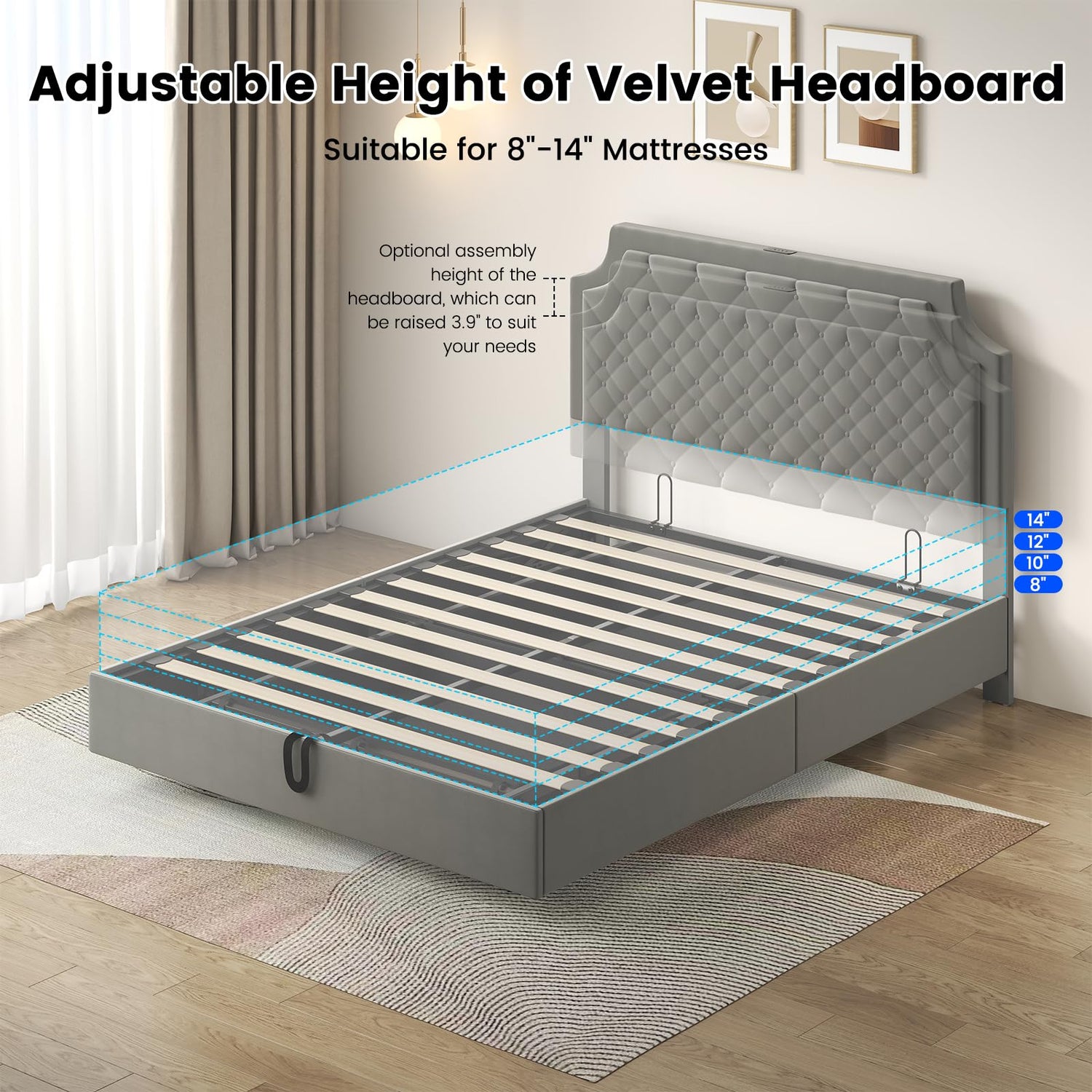 Customization is at the forefront with an adjustable headboard that can be tailored to your needs during installation. This unique feature allows for height adjustments of up to 3.9 inches, accommodating various mattress sizes ranging from 8 to 14 inches, ensuring a perfect fit for your sleep setup.
