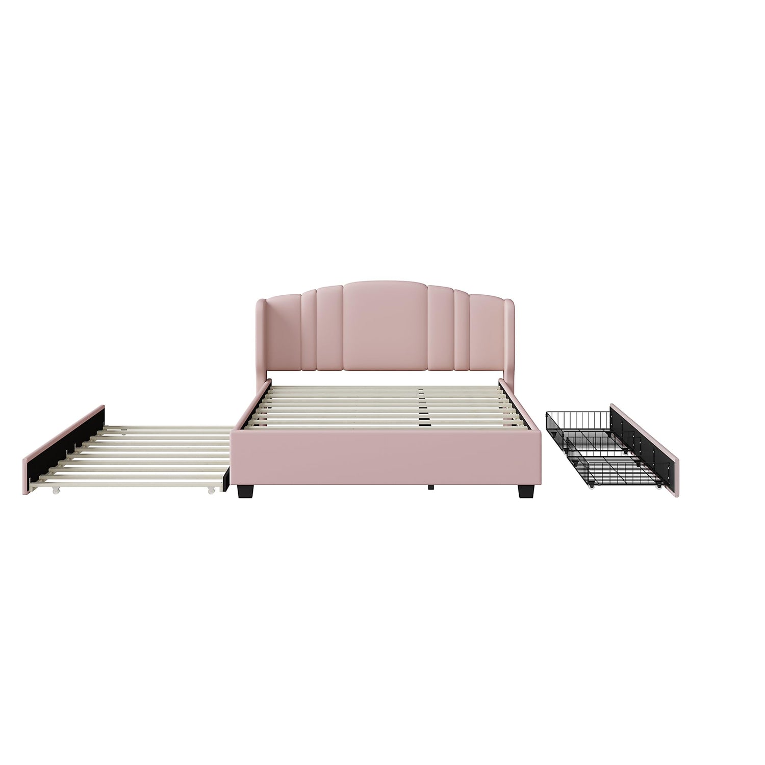 Queen Size Platform Bed Frame, Linen Fabric Upholstered Bed with Wingback Headboard, Twin Size Trundle and 2 Drawers, No Box Spring Needed, Easy Assembly (Pink)