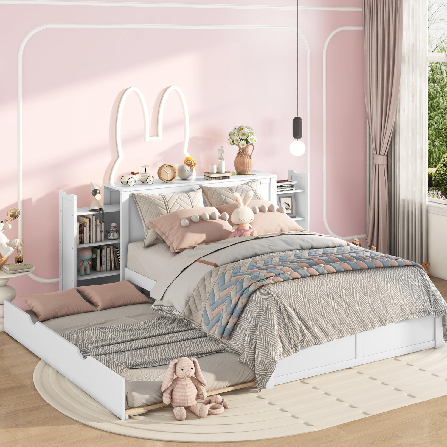 Queen Size Storage Bed with Trundle, Wood Platform Bed Frame with Storage Shelves Headboard and Twin Size Trundle Bed, Wooden Queen Beds for Kids Boys Girls Teens, White