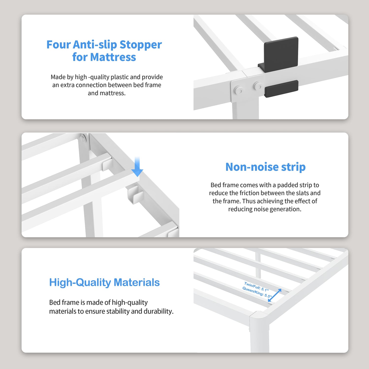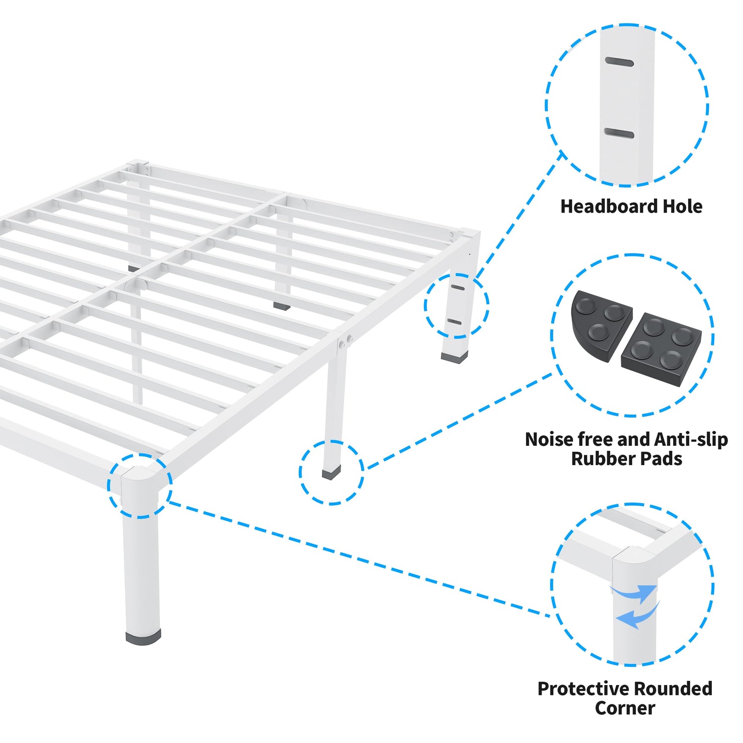 • Noise Free Bed Frame: White metal bed frame is equipped with silent foam, and the queen bed frame adopts a reinforced screw lock structure to ensure that the bed frame will not shake and squeak, ensuring a noiseless sleep
