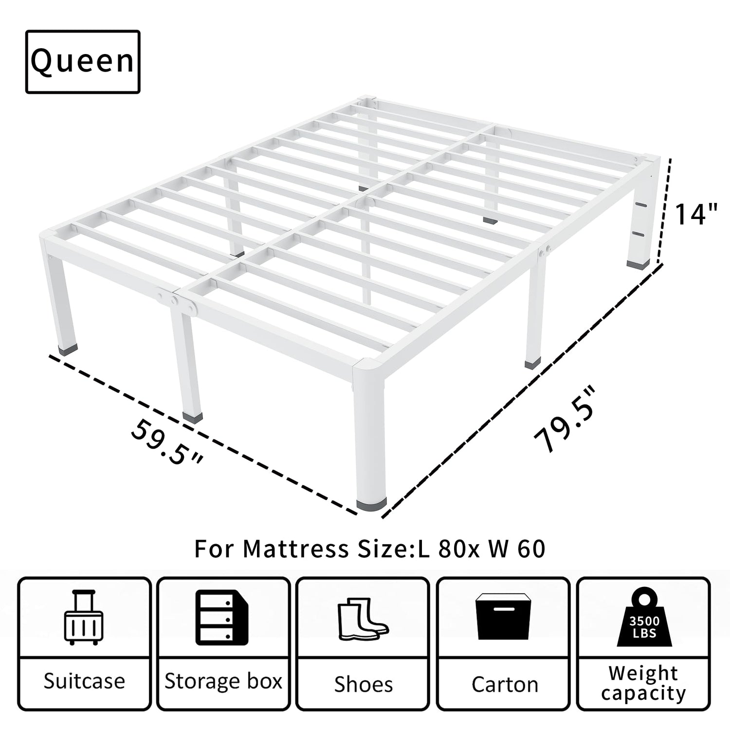 • Roil White Queen Bed Frame in Great Material: Heavy duty queen bed frame made by great steel and 3500lbs capacity, Powder coated surface, Non scratchable. Queen bed frames size-79.5x59.5inch. Suitable for 80x60 mattress