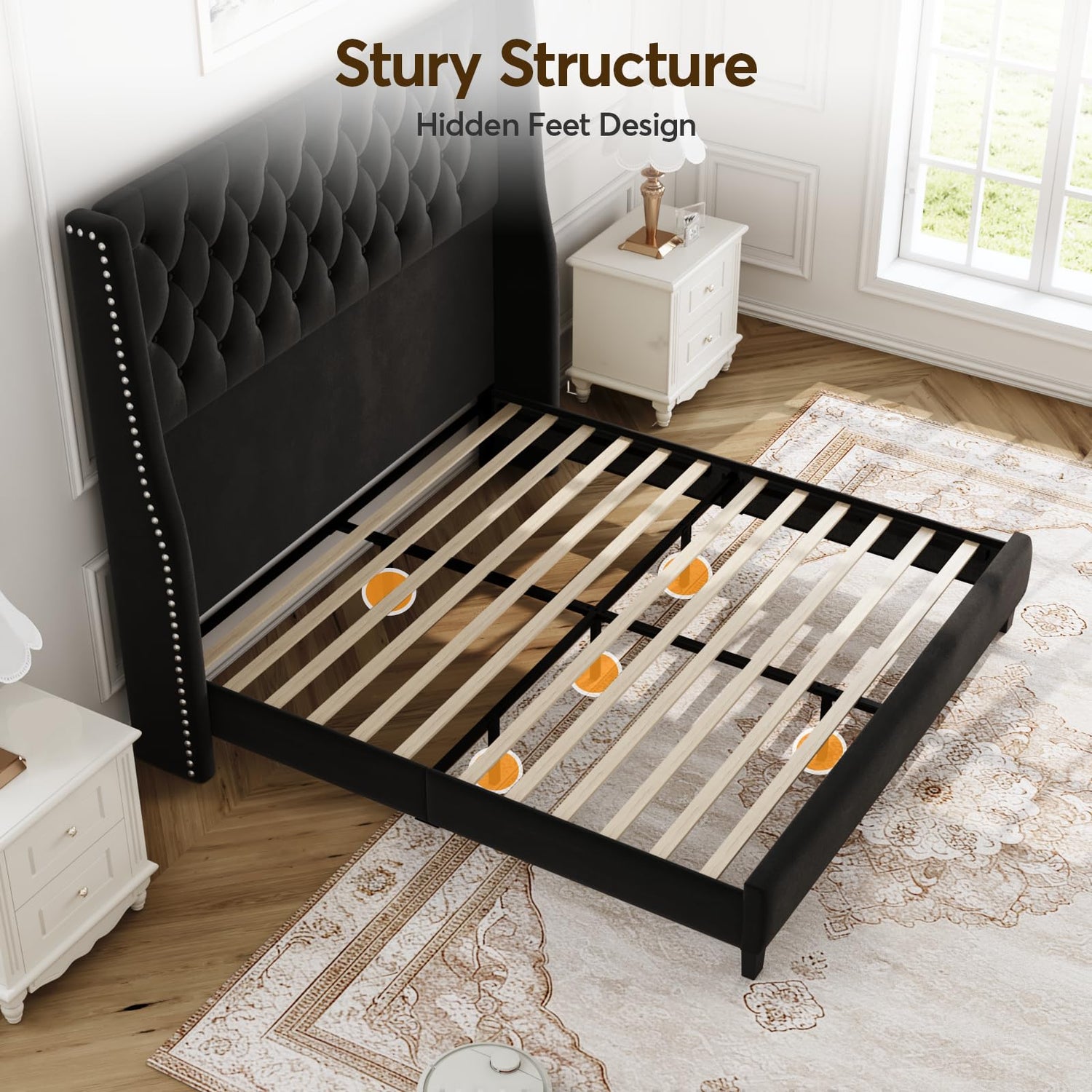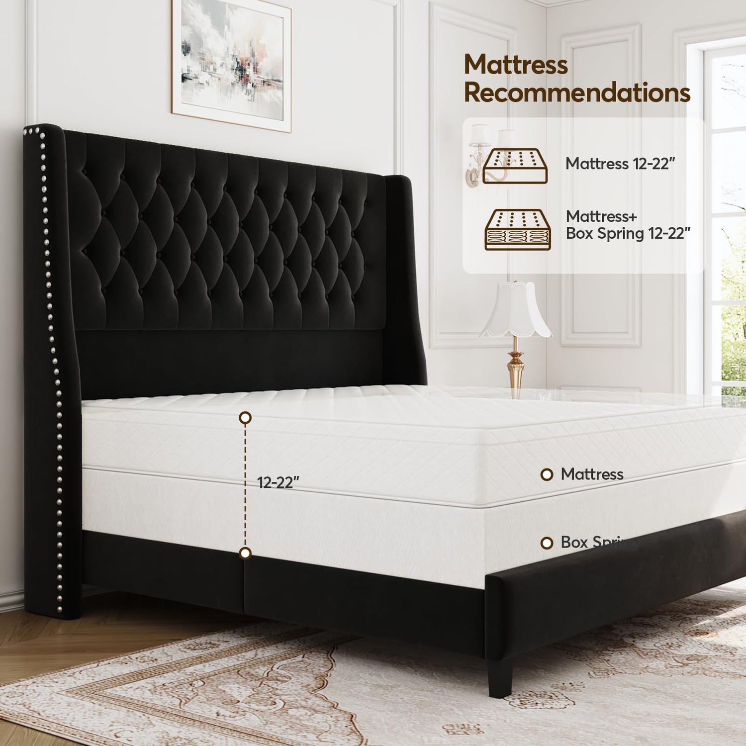 • Premium soft velvet fabric: Our upholstered bed frames choose high-quality velvet fabric, which feels comfortable and is durable. The appearance is elegant and high-end. It makes you feel comfortable and luxurious, as warm and textured as home.