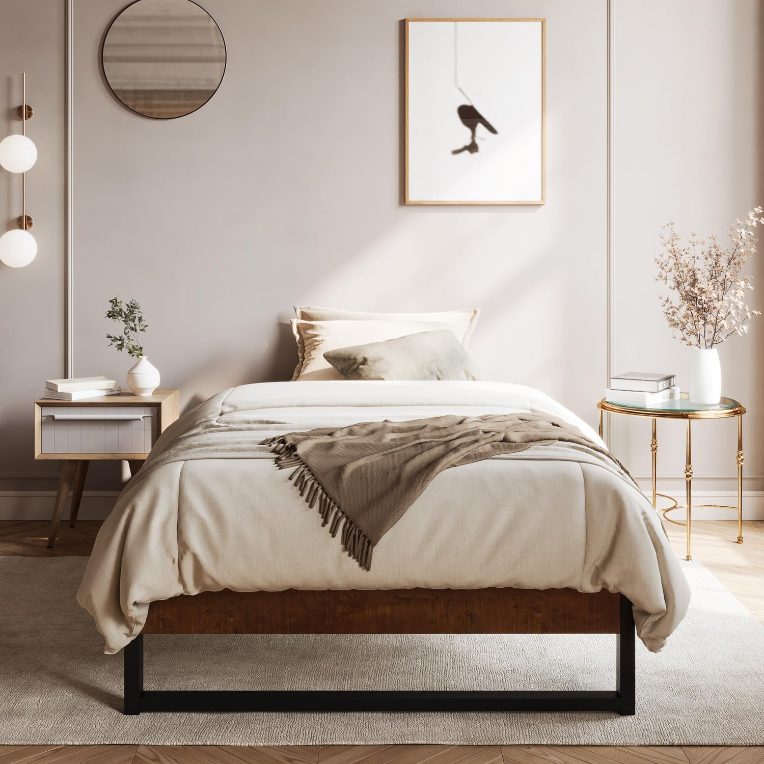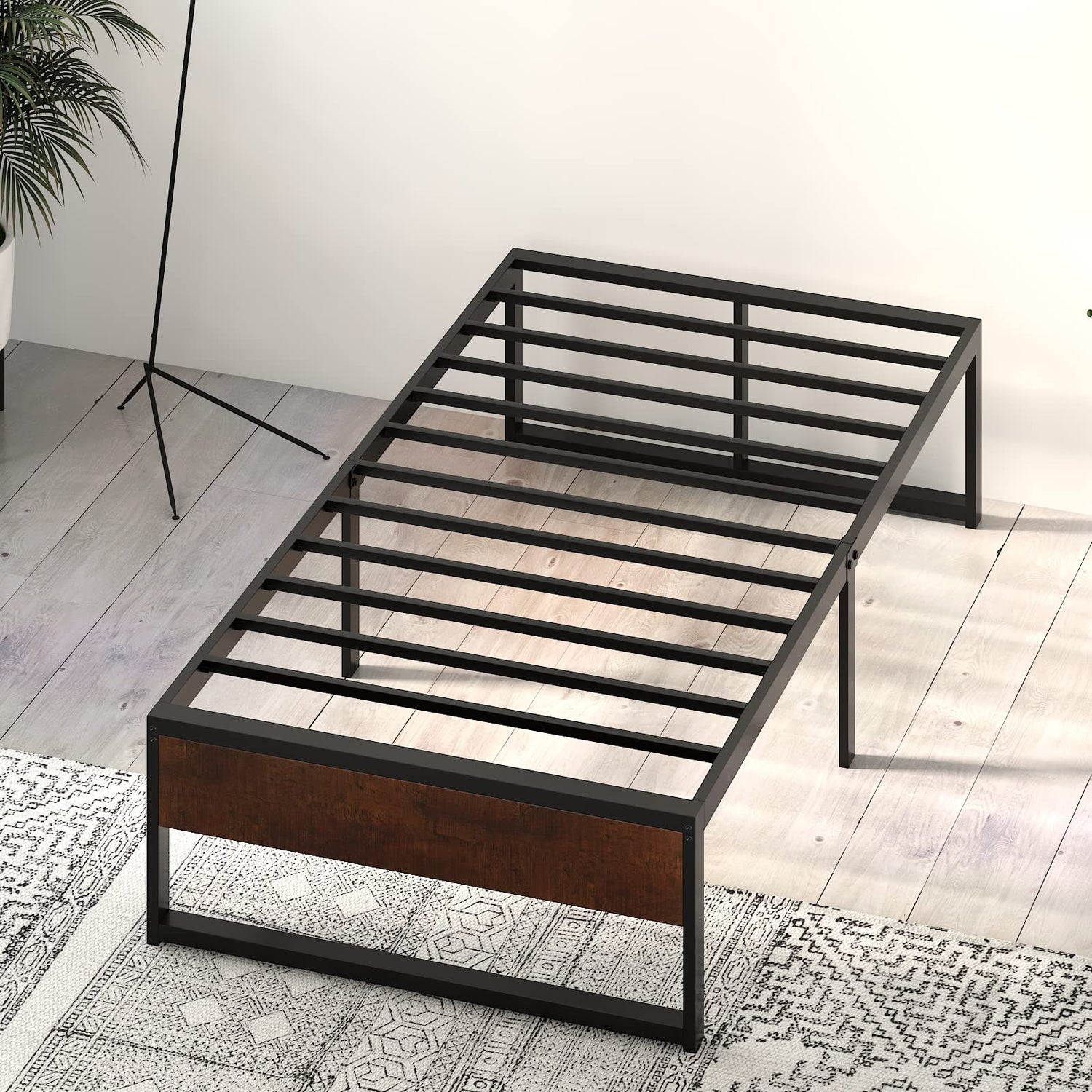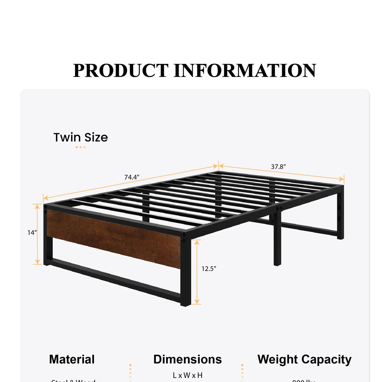SHA CERLIN 14'' Twin Size Metal Platform Bed Frame with Rustic Wood & Reverse Holes/Ample Under-Bed Storage Space/Mattress Foundation/No Box Spring Needed/Easy Assembly