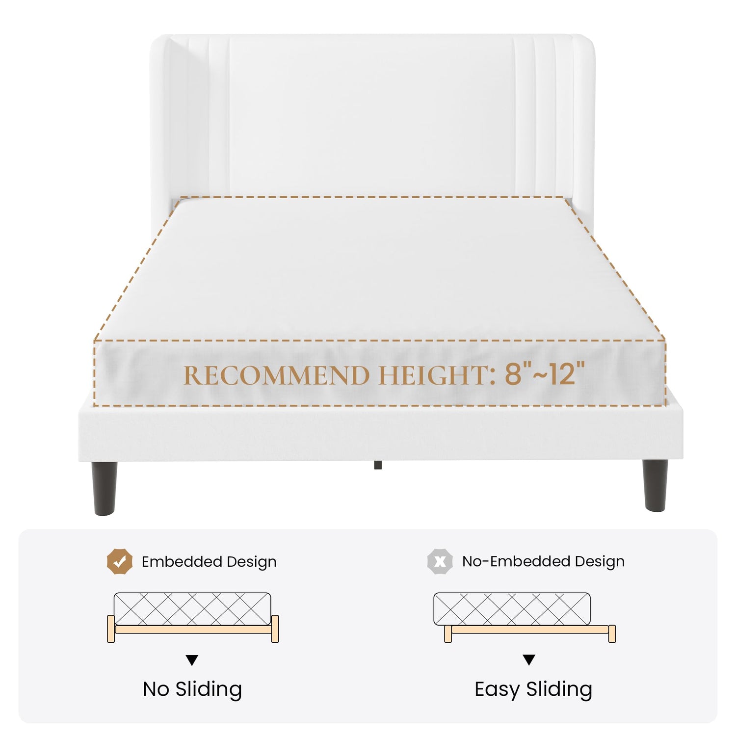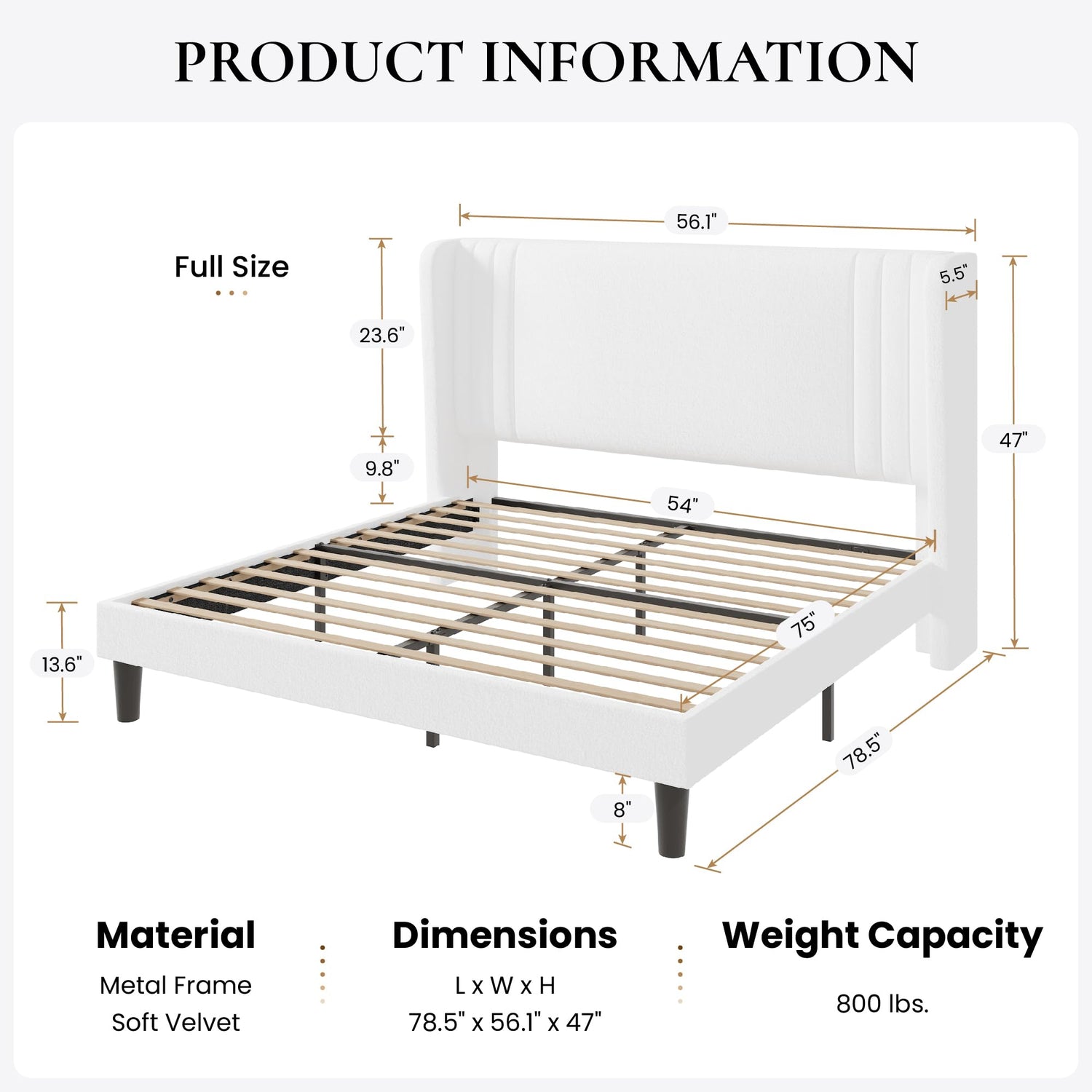 SHA CERLIN Full Size Velvet Upholstered Platform Bed Frame with Vertical Channel Tufted Wingback Headboard, Wooden Slats Support, Easy Assembly, Under Bed Storage, No Box Spring Required, White