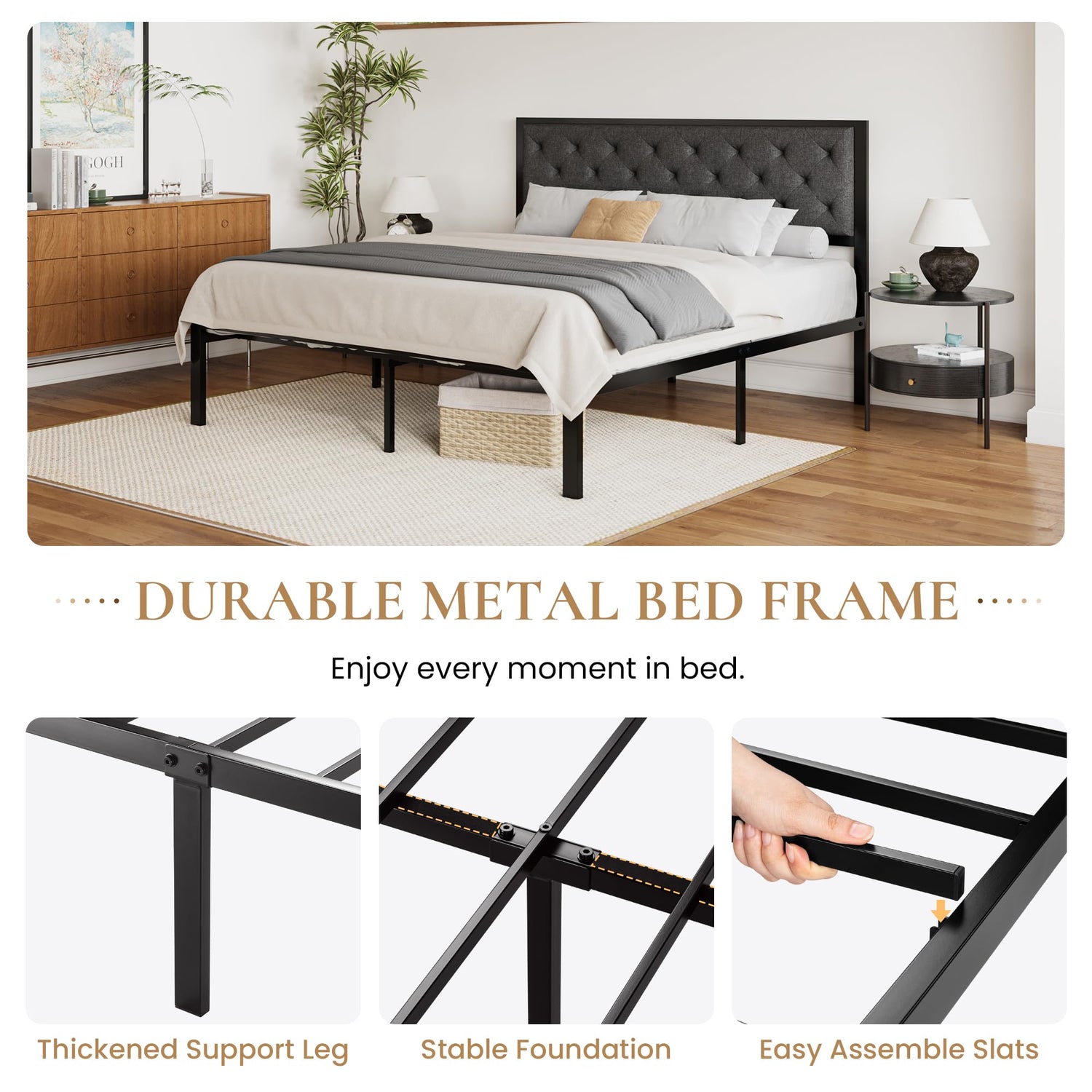 - 【Sturdy Support】Reinforced metal slats offer excellent support for various mattress types, eliminating the need for a box spring and saving money. With a maximum weight capacity of 1000 lbs, durable for couples and families without sagging or wobbling.