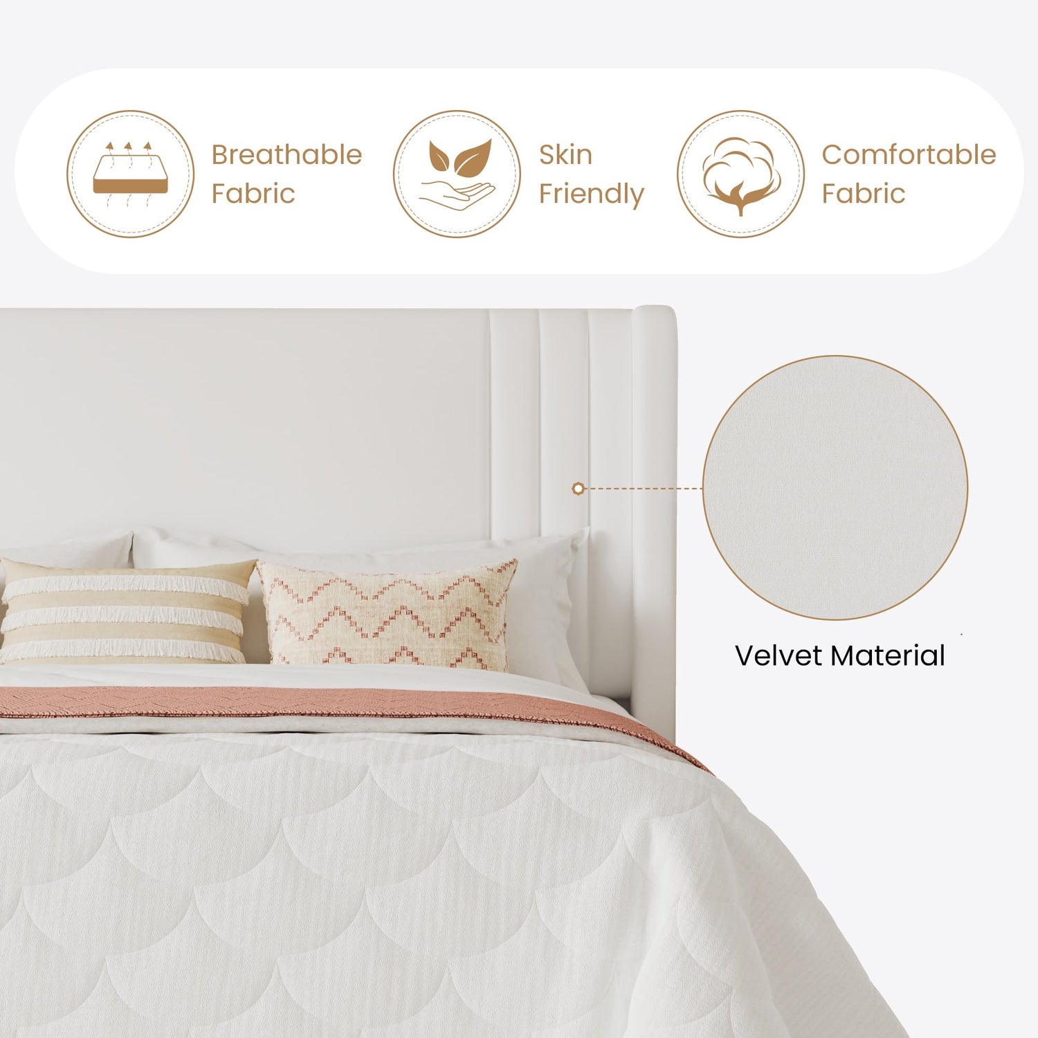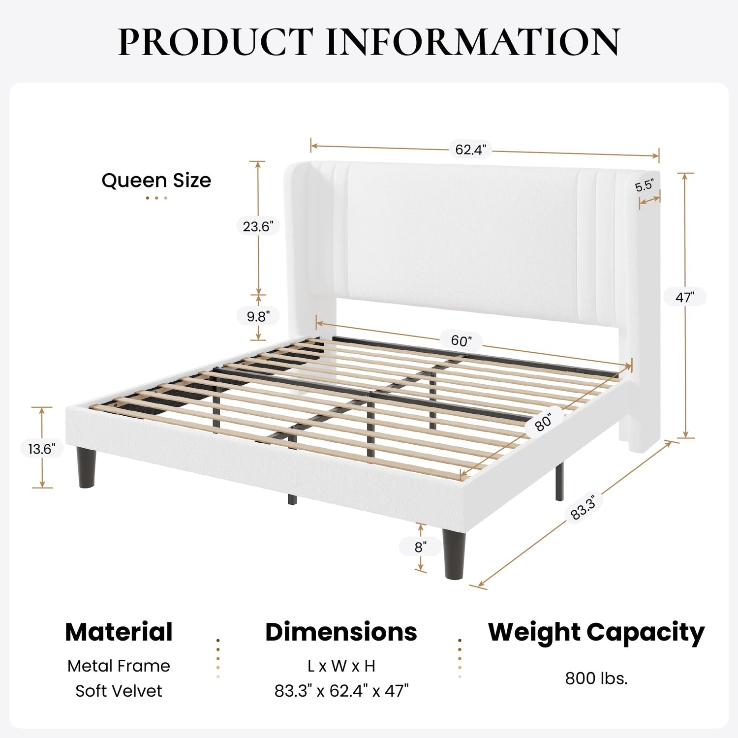 SHA CERLIN Queen Size Velvet Upholstered Platform Bed Frame with Vertical Channel Tufted Wingback Headboard, Wooden Slats Support, Easy Assembly, Under Bed Storage, No Box Spring Required, White
