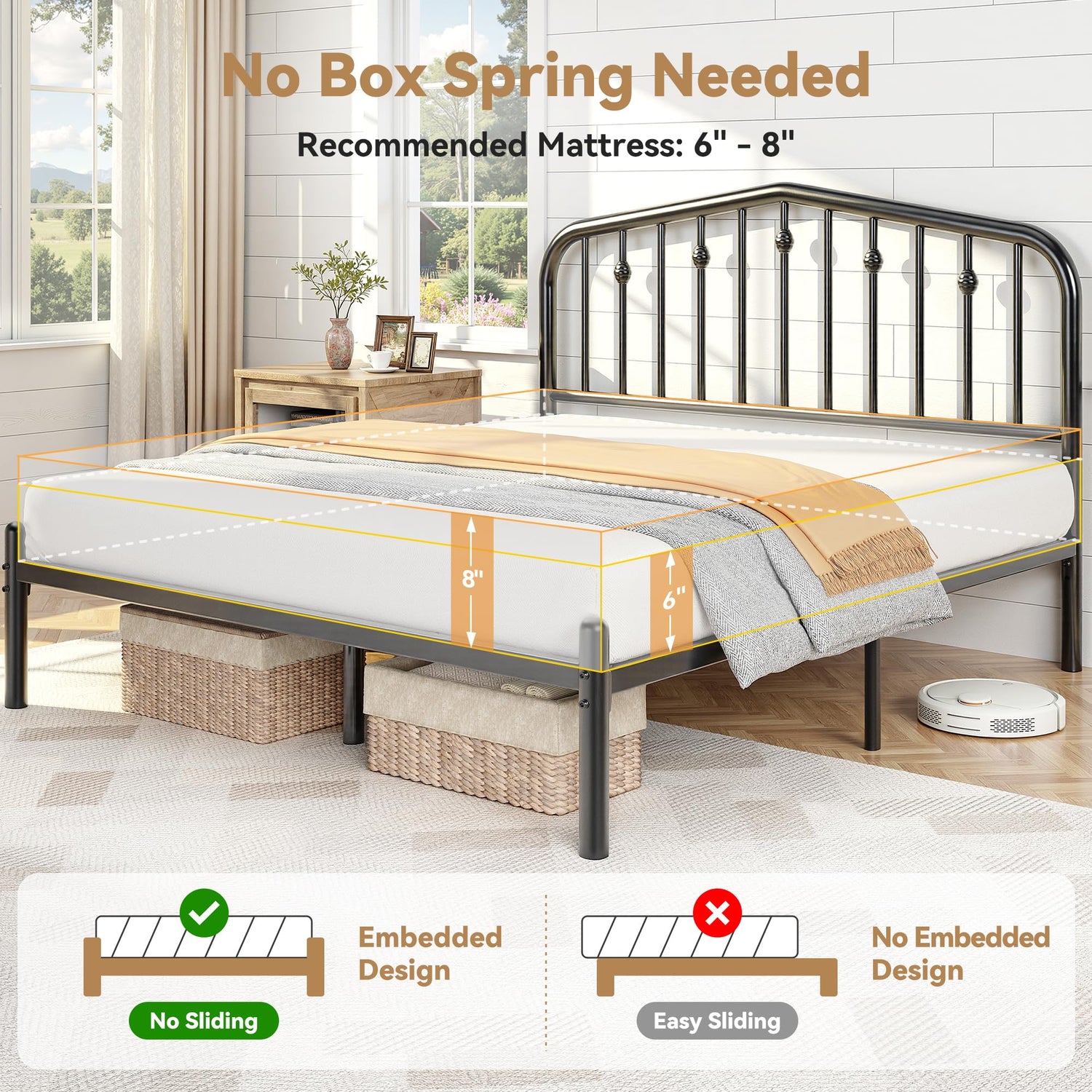 - ✅【Anti-slide & Protective Foot Pads】The footboard of metal bed frame is higher than the middle that effectively prevents your mattress from sliding. Our bed frame queen size is suitable with 6" to 10" height mattress and no box spring is needed; The curved corner of headboard plus with the round balls on the bedposts, largely avoiding any sharp collision impacts; Besides, you do not need to worry any scratches as we design foot pads under each bed leg for protecting your floor from scratching