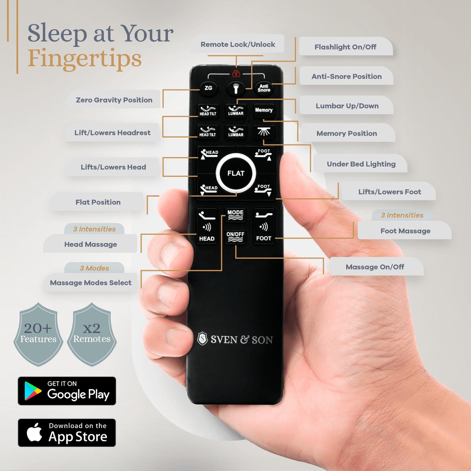 • Innovative Ergonomic Remote: Dive into a realm of relaxation with settings such as Zero Gravity for weightlessness and Anti-Snore for unobstructed breathing. The remote boasts memory positions to save your favorite settings, under-bed lighting for soft illumination, and individual lumbar and head tilting for precision adjustments.