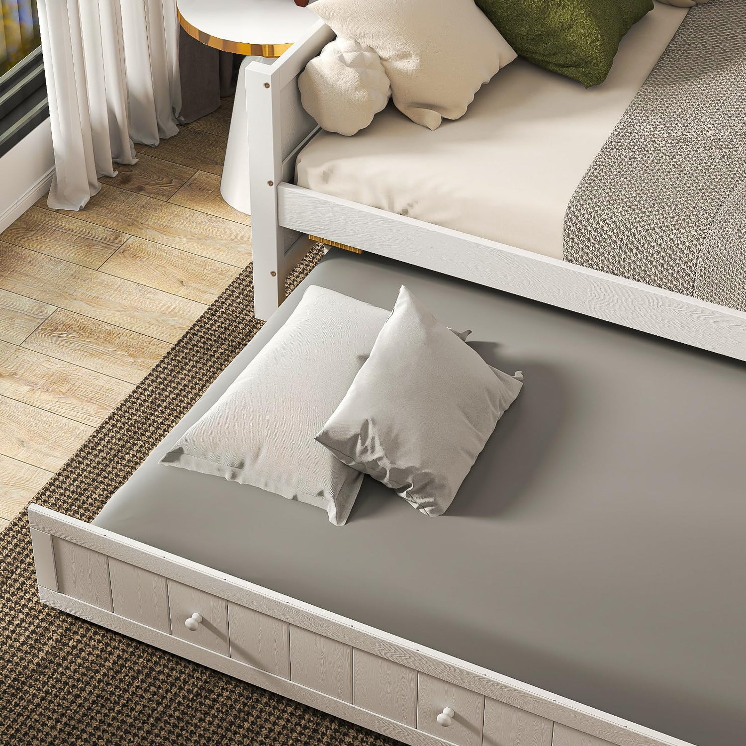 Sweetcrispy Twin Size Day Bed Frame with Trundle, Integrated Headboard & Armrests, Space-Saving Trundle Bed for Living Room, Bedroom, Guest Room, Sturdy Wood Construction for Adults and Kids, White