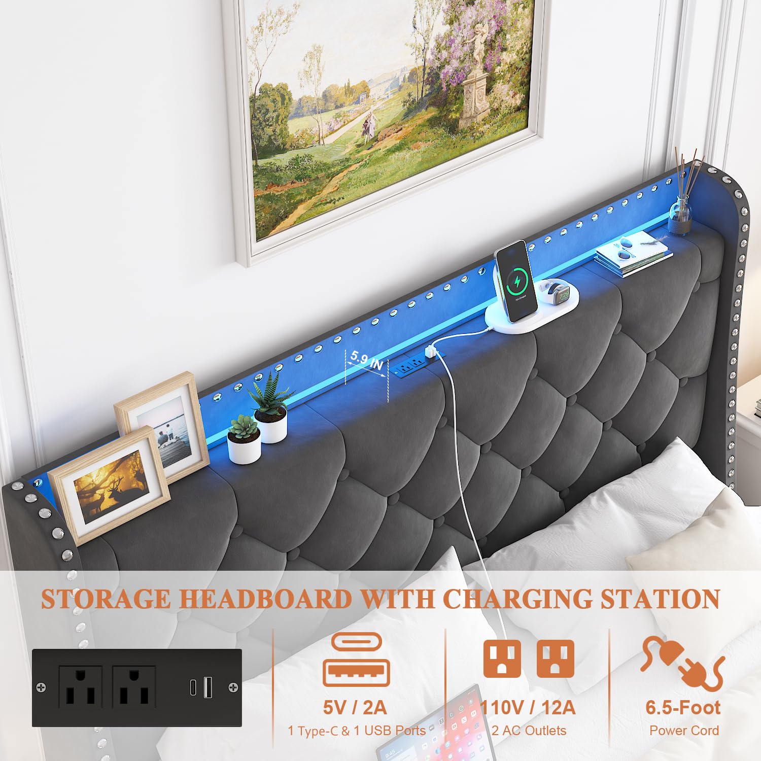 Designed with practicality in mind, the headboard offers a storage shelf equipped with two standard plug outlets, one USB port, and one Type-C port, all connected by a 6.5ft long power supply cord. Enjoy the convenience of charging your devices while keeping your nightly essentials like books, alarm clocks, and photo frames within easy reach.
