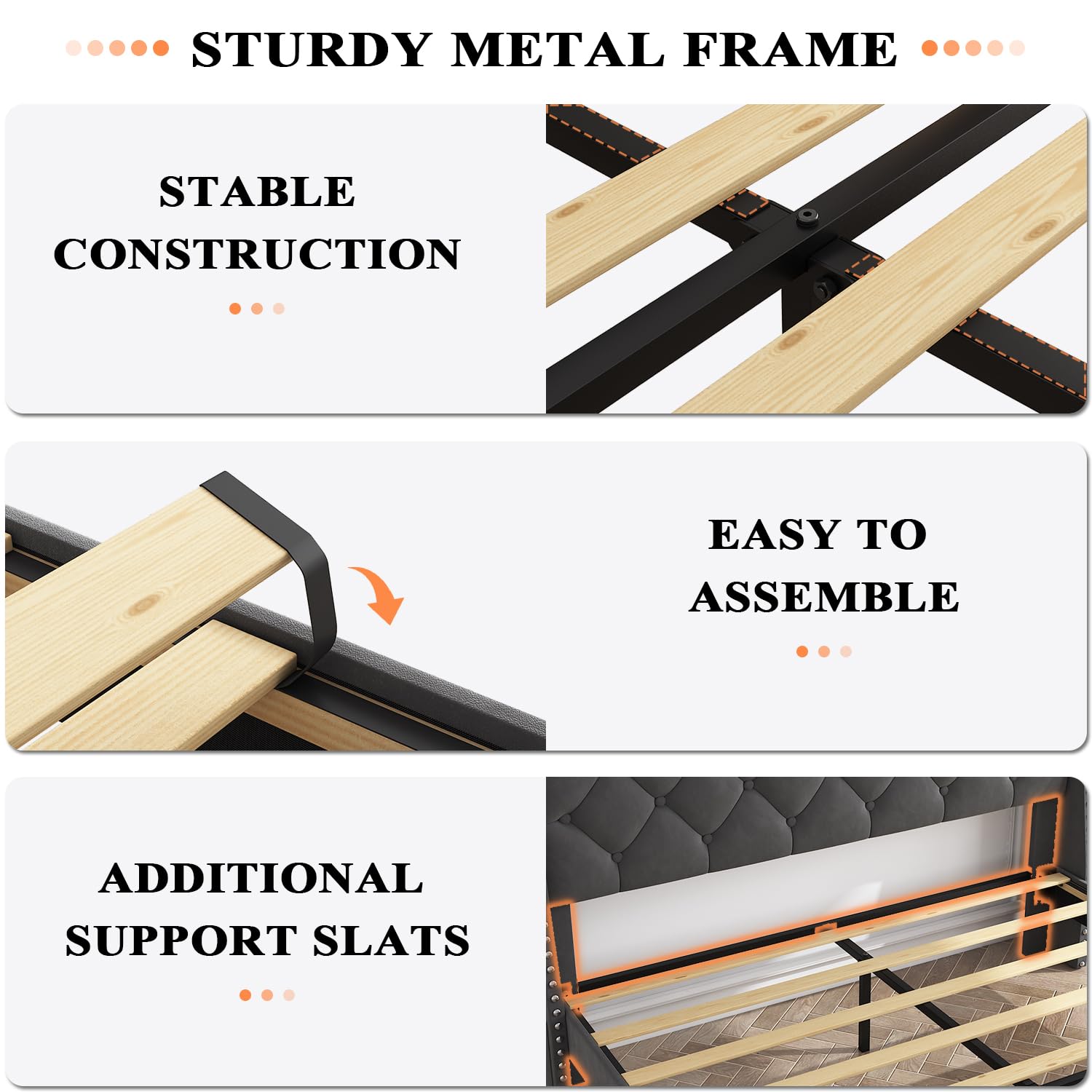 Elevate your living space and enjoy a harmonious blend of style and practicality with the TIGUBFRE Dark Grey Upholstered Full Size Bed Frame—a bed frame that redefines comfort and convenience.