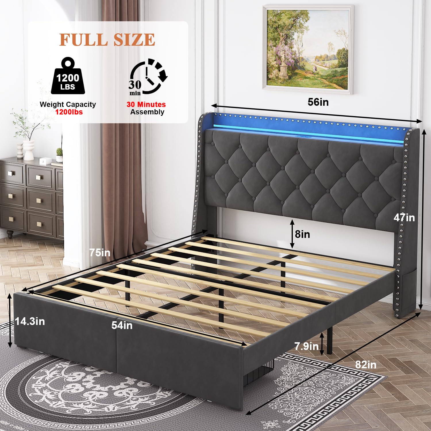 TIGUBFRE Dark Grey Upholstered Full Size Bed Frame with LED Lights and Storage Drawers