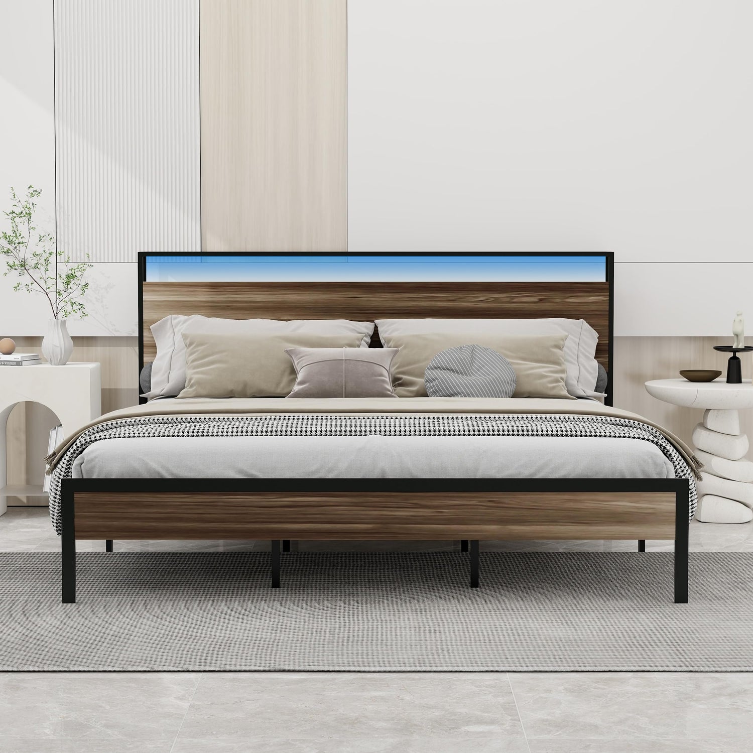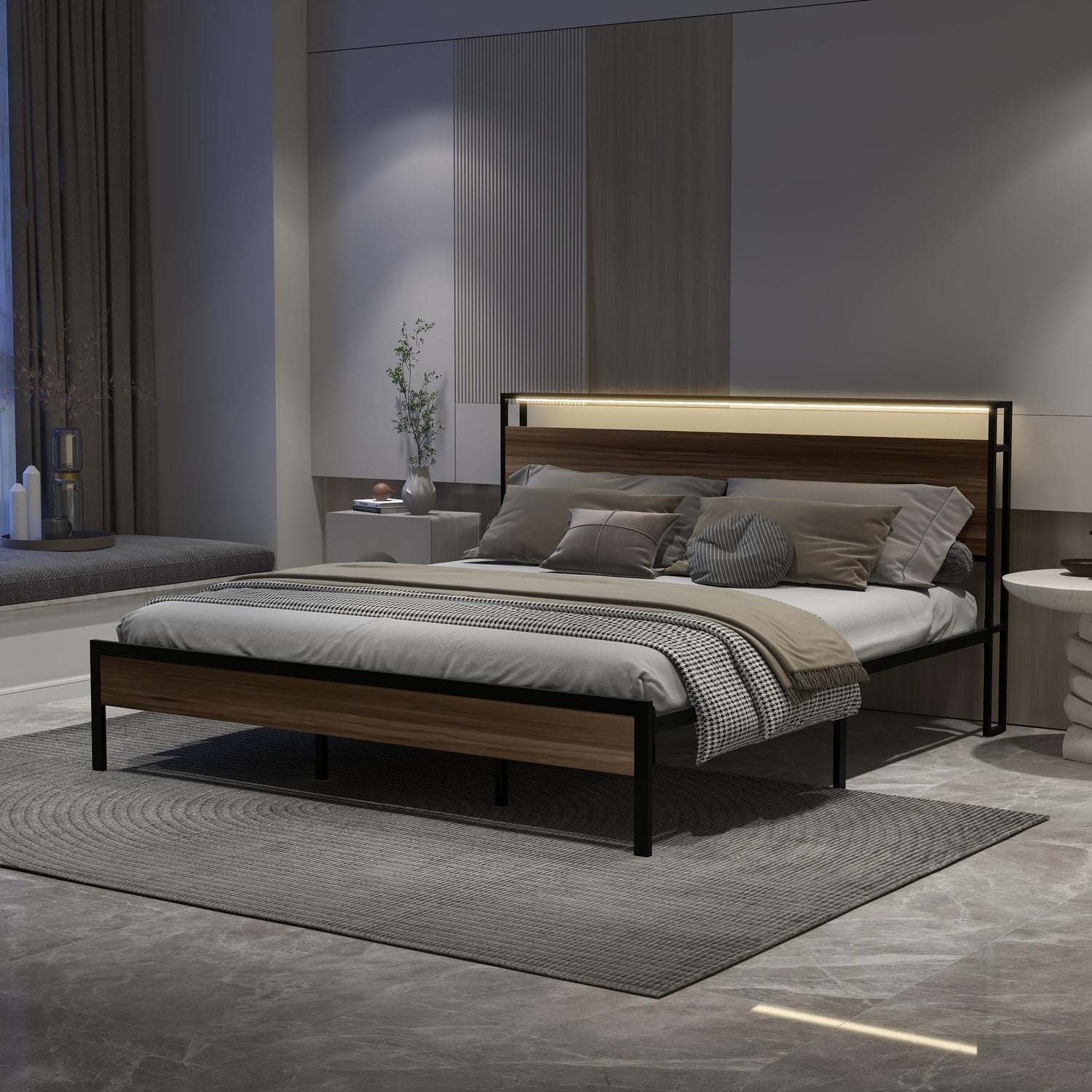 Tuconia Grey King Bed Frame with LED Lights, Storage Headboard & Built-In Charging Station