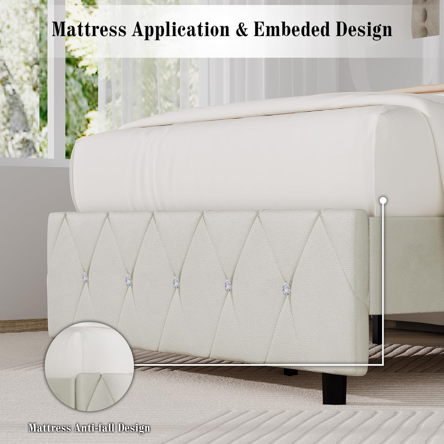 - Fashion and Luxury: Draped in sleek cream faux leather with sparkly diamond accents and tufted detailing, this twin size bed frame cream screams modern elegance