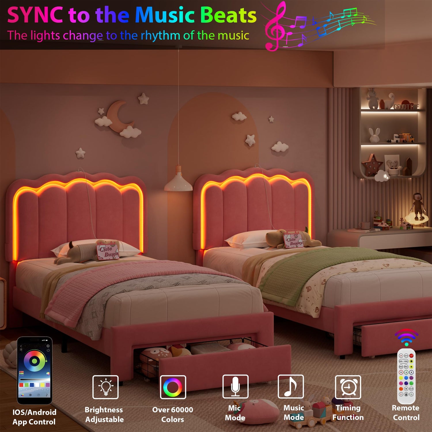 - MULTI-FUNCTION RGB LED BED: The headboard of this twin bed frame features a built-in smart RGB light strip that can be controlled via an app or remote. With over 16 million colors, 20+ preset lighting effects, and multiple smart modes, you can effortlessly create the perfect ambiance for your bedroom. Whether you need warm lighting for reading, vibrant colors for a party, or a practical nightlight for children who are afraid of the dark, this LED bed frame has it all. Especially in intelligent music sync mode, the LED lights flash in rhythm with the music, providing you with an immersive home concert experience