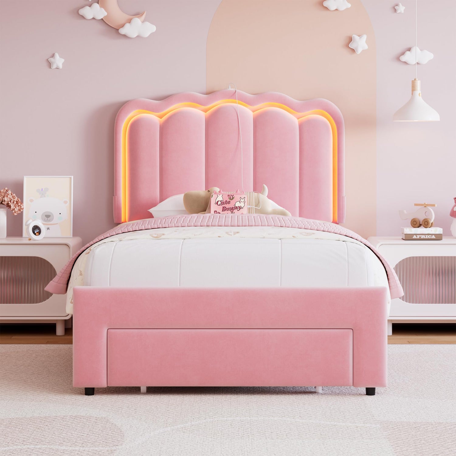 Twin Upholstered LED Bed Frame with Storage Drawer and Adjustable Chic Double Wavy Headboard, Velvet Princess Platform Bed for Girls/Kids, Solid Wood Slats Support, No Box Spring Needed, Pink