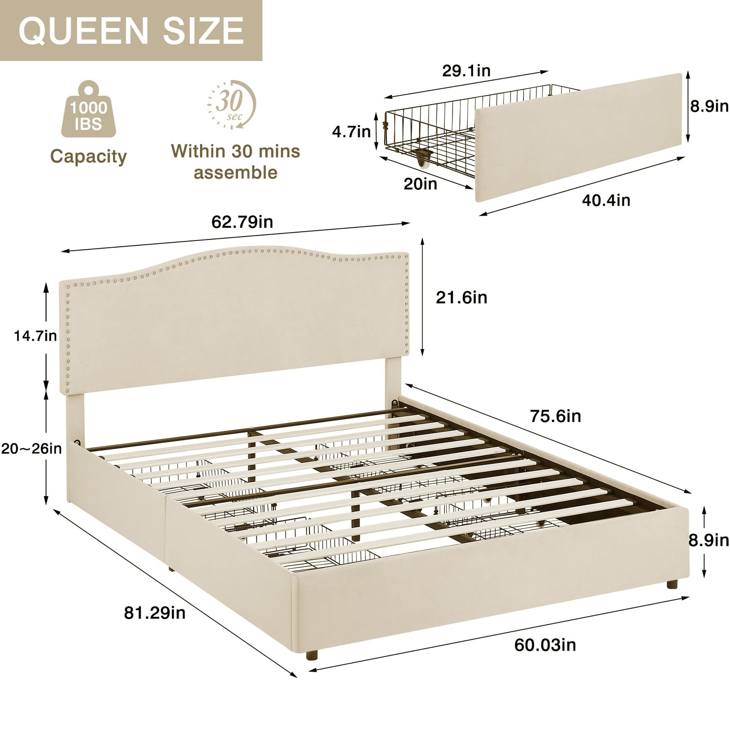 • 【Bed Frame with 4 Storage Drawers】The bed frame with 4 storage drawers features easy-to-use wheels on each drawer for effortless sliding in and out. These spacious drawers provide ample storage space for your seasonal bedding, clothing, toys, and more. Each drawer measures 40.2’’L x 16.9’’W x 9.4’’H.