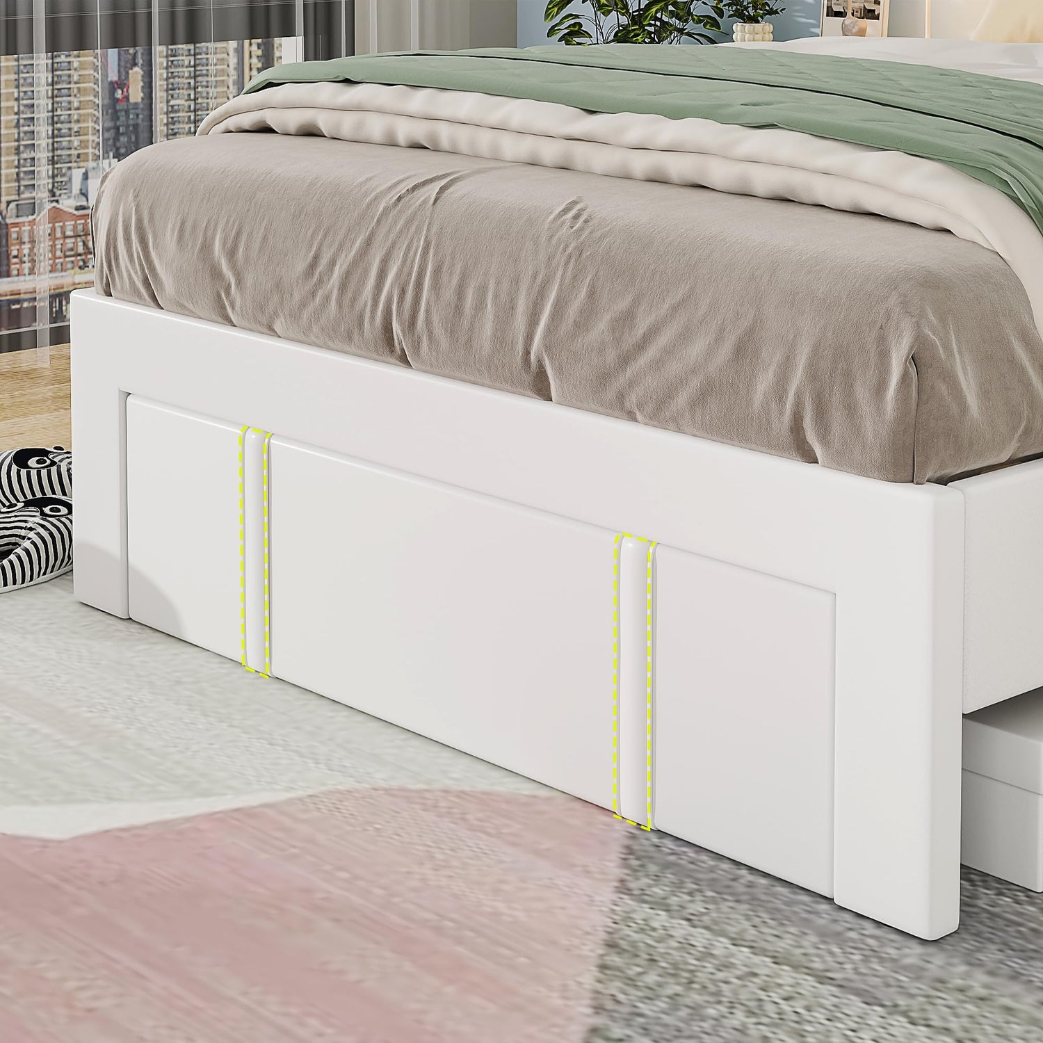 VECELO Twin Size Bed Frame with Storage Drawers, Leather Upholstered with Diamond Tufted Headboard, Solid Wood Slat Support, No Box Spring Needed, White