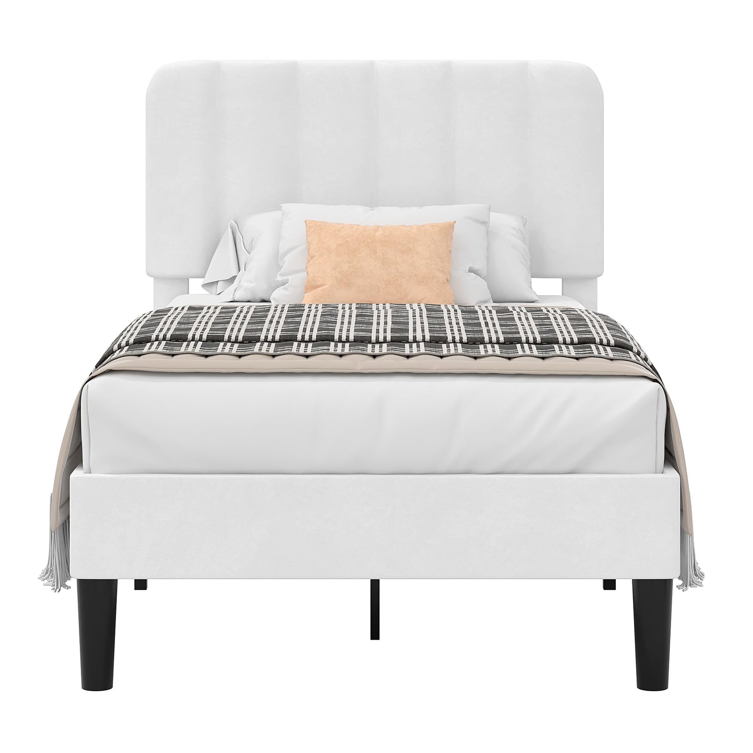 VECELO Twin Size Bed Frame with Upholstered Headboard, Velvet Platform Bedframe Mattress Foundation, Strong Wood Slat Support, No Box Spring Needed,White