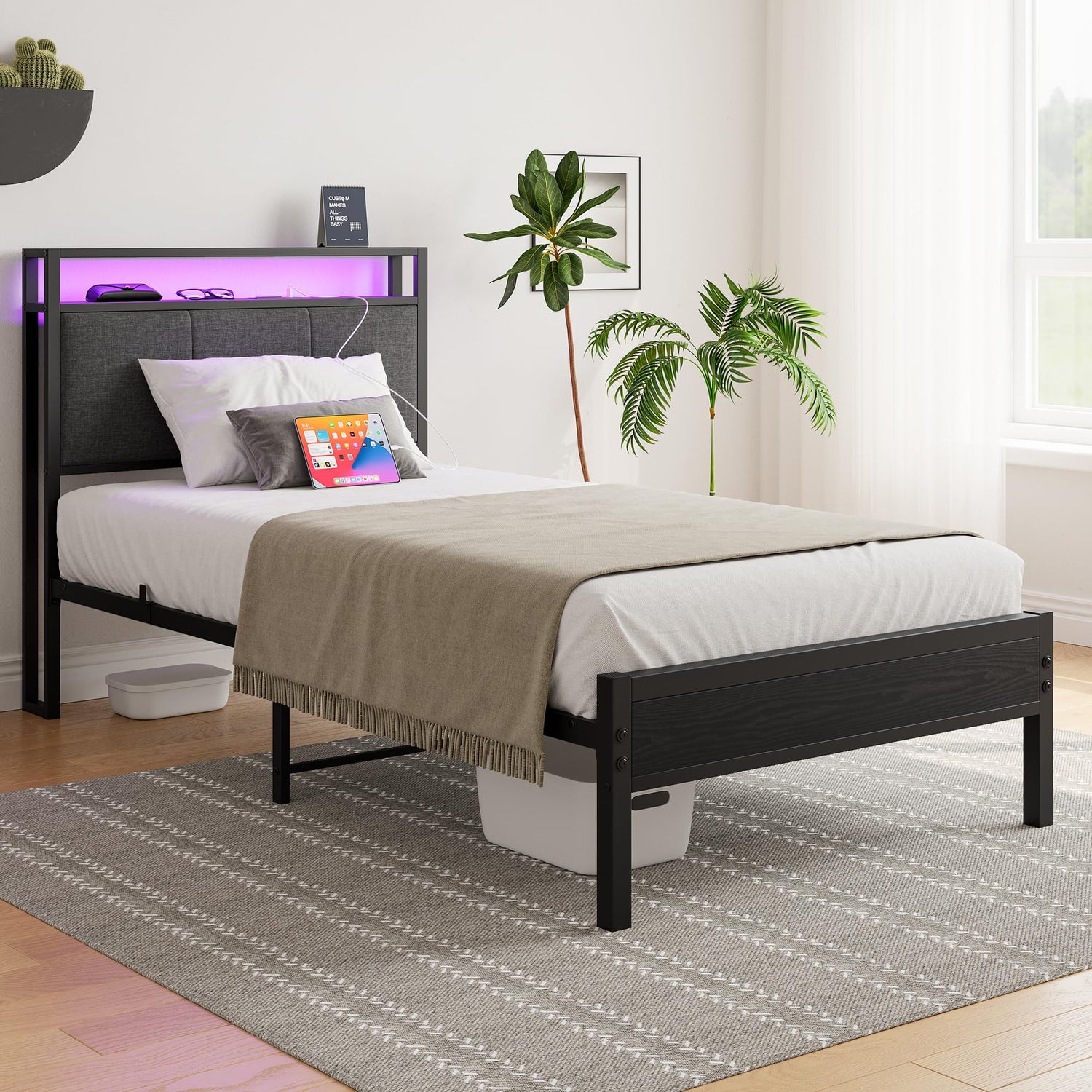 VECOCHO Twin Bed Frame with Charging Station and LED Lights,Upholstered Headboard with Storage Shelves,Heavy Duty Metal Slats, No Box Spring Needed,Noise Free, Easy Assembly,Black and Dark Grey