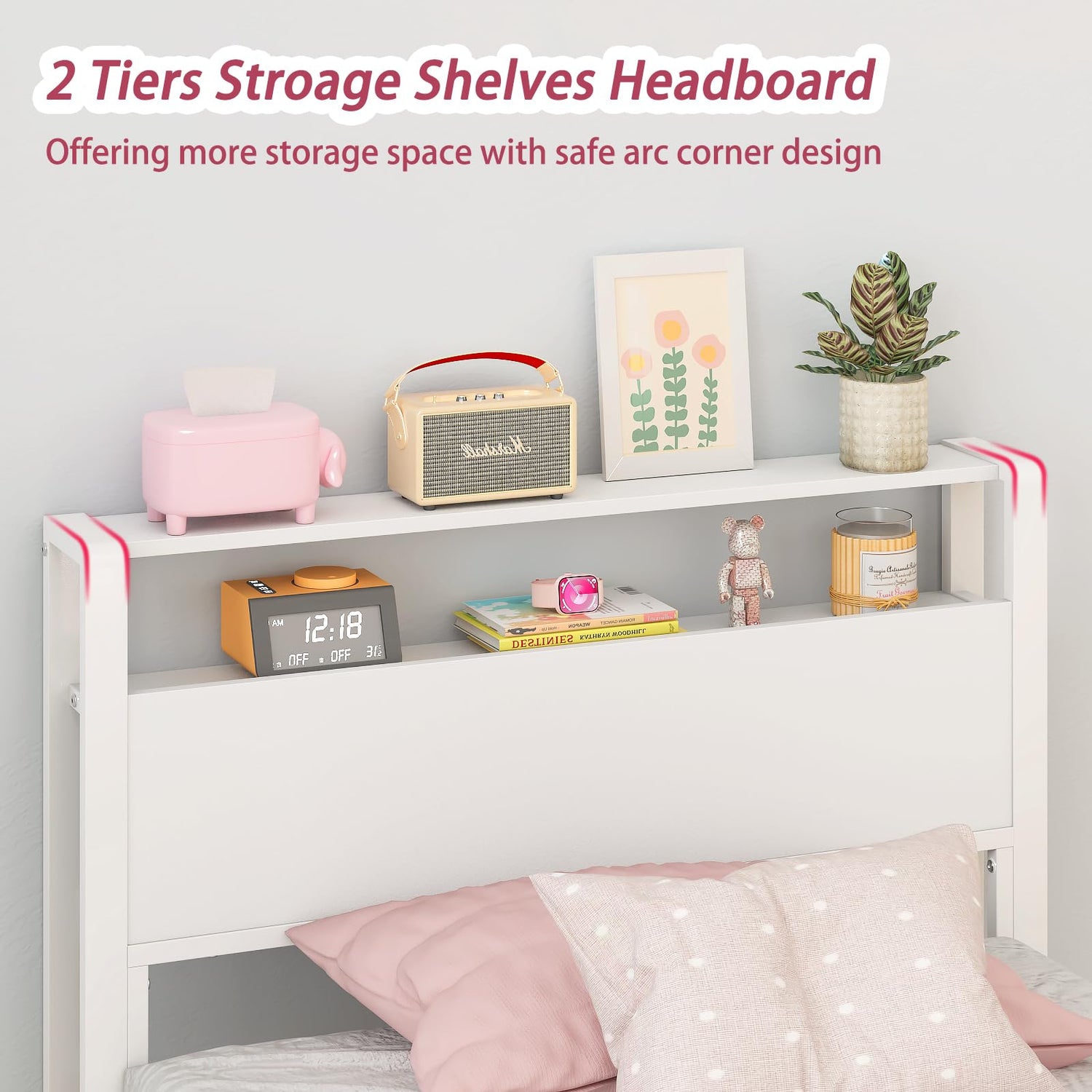 Weehom Twin Bed Frames for Kids, Twin Size Bed with 2 Tiers Wood Shelves Headboard No Box Spring Needed Easy Assembly Heavy Duty Metal Plaform, White