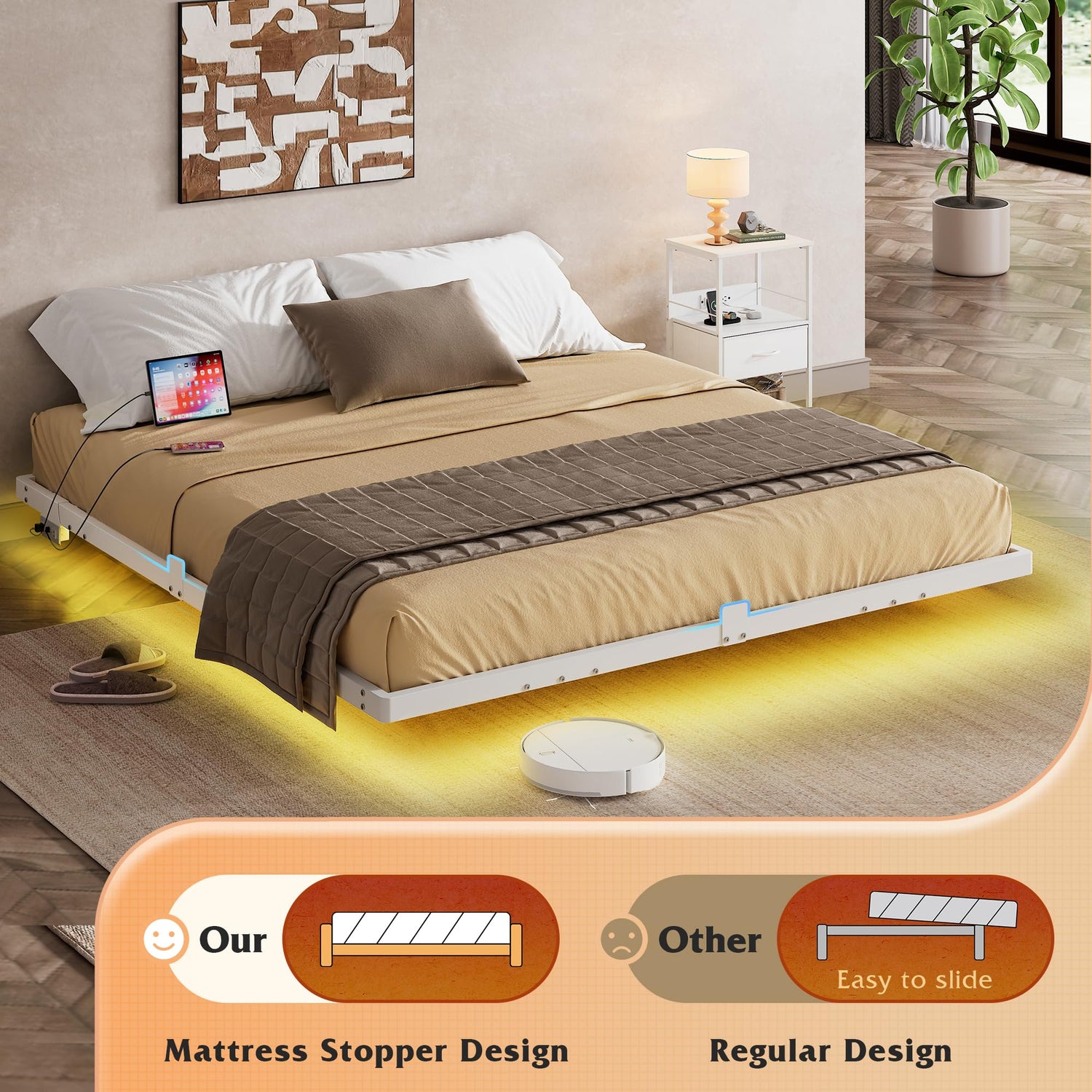 WLIVE Floating King Bed Frame, LED Bed Frame with Charging Station, Metal Platform Beds King Size with Heavy Duty Steel Slats, No Box Spring Needed, Easy Assembly, No Noise, White