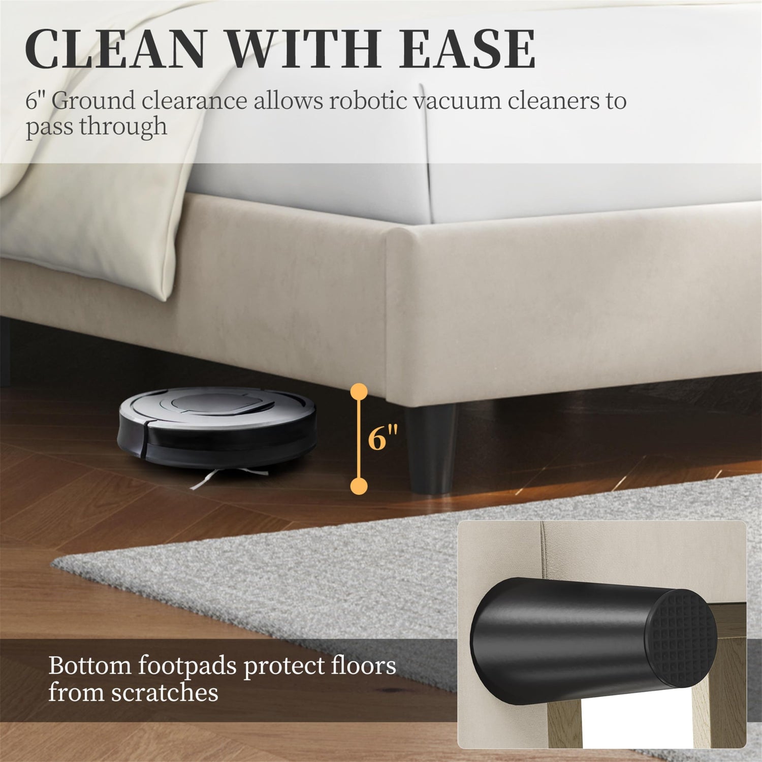 • Reasonable Under-bed Space: 6" ground clearance allows vacuum cleaning robots to pass through easily, making cleaning this full bed frame a breeze for you