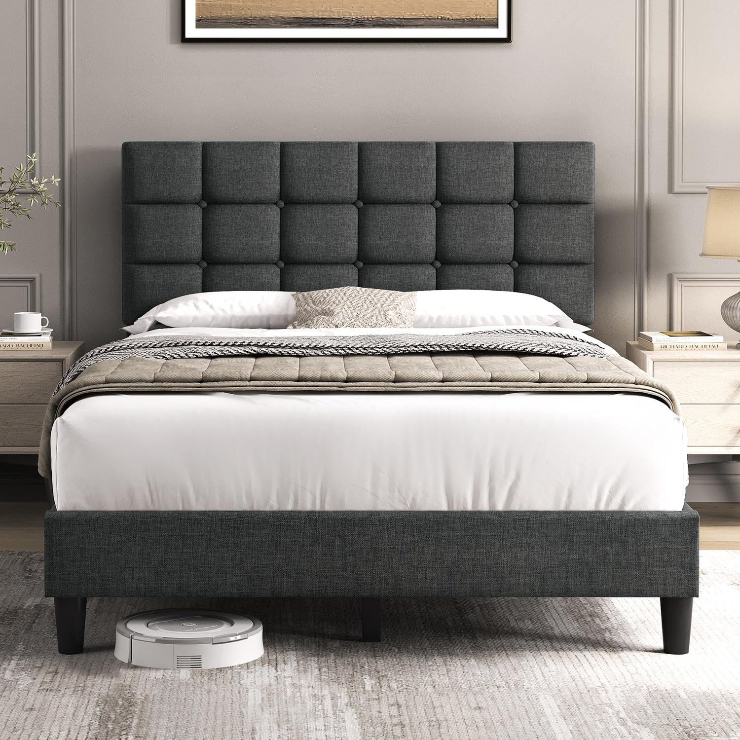 Yaheetech Upholstered Bed Frame, Modern Full Bed Platform with Square Stitched&Button Tufting Headboard Height Adjustable, Wooden Slats Support, No Box Spring Needed, Full Size, Dark Gray