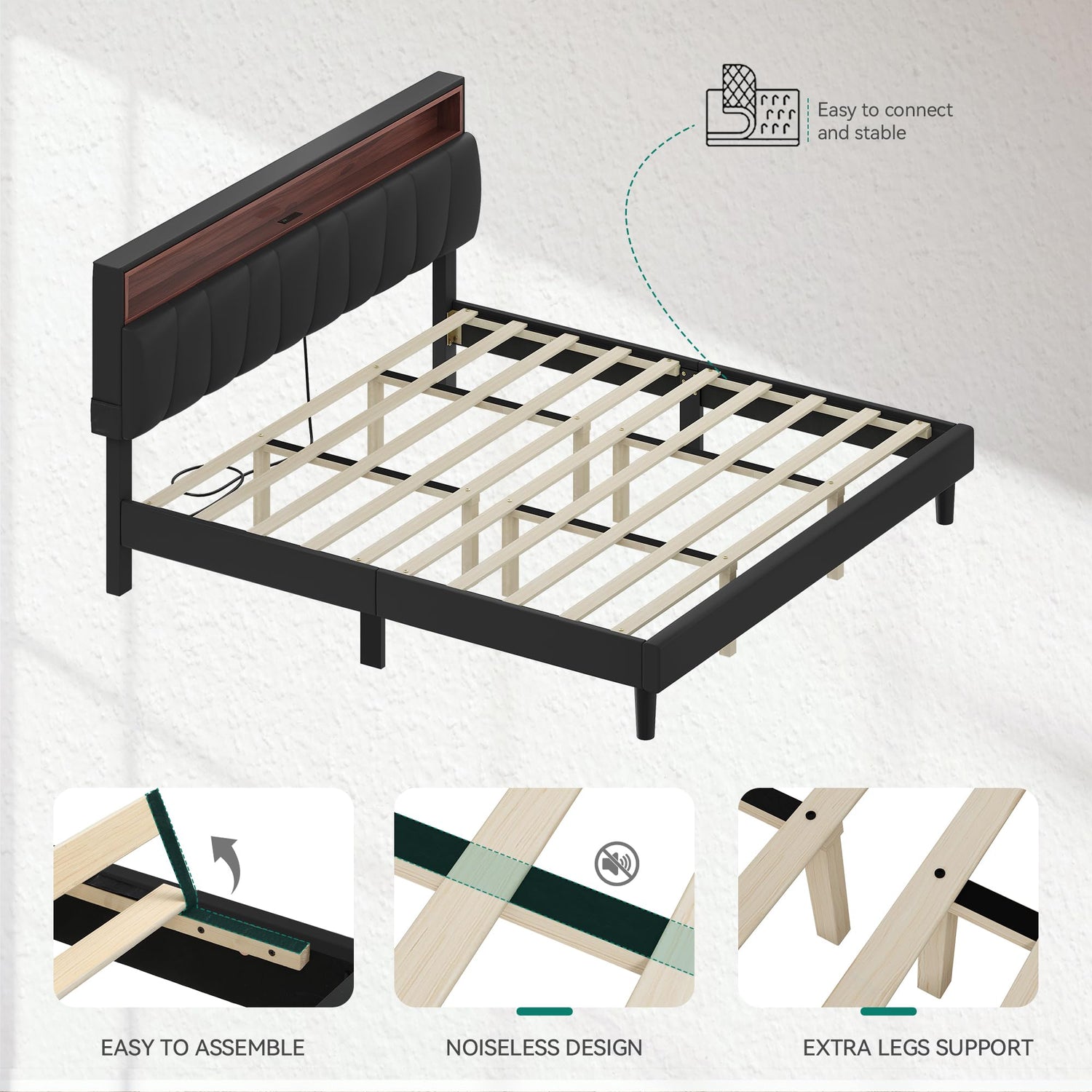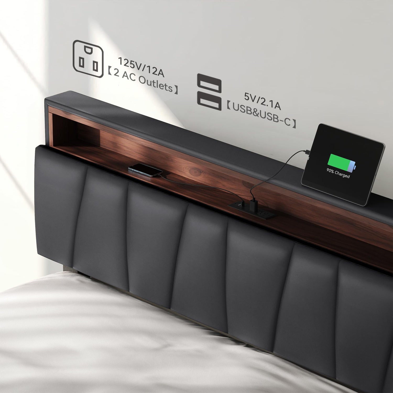 - Integrated Convenience: Our king bed frame revolutionizes relaxation with an built in charging station nestled within the headboard; The American standard outlets and USB plus type-c ports make device charging a breeze; Enjoy recharging your devices effortlessly from your bed
