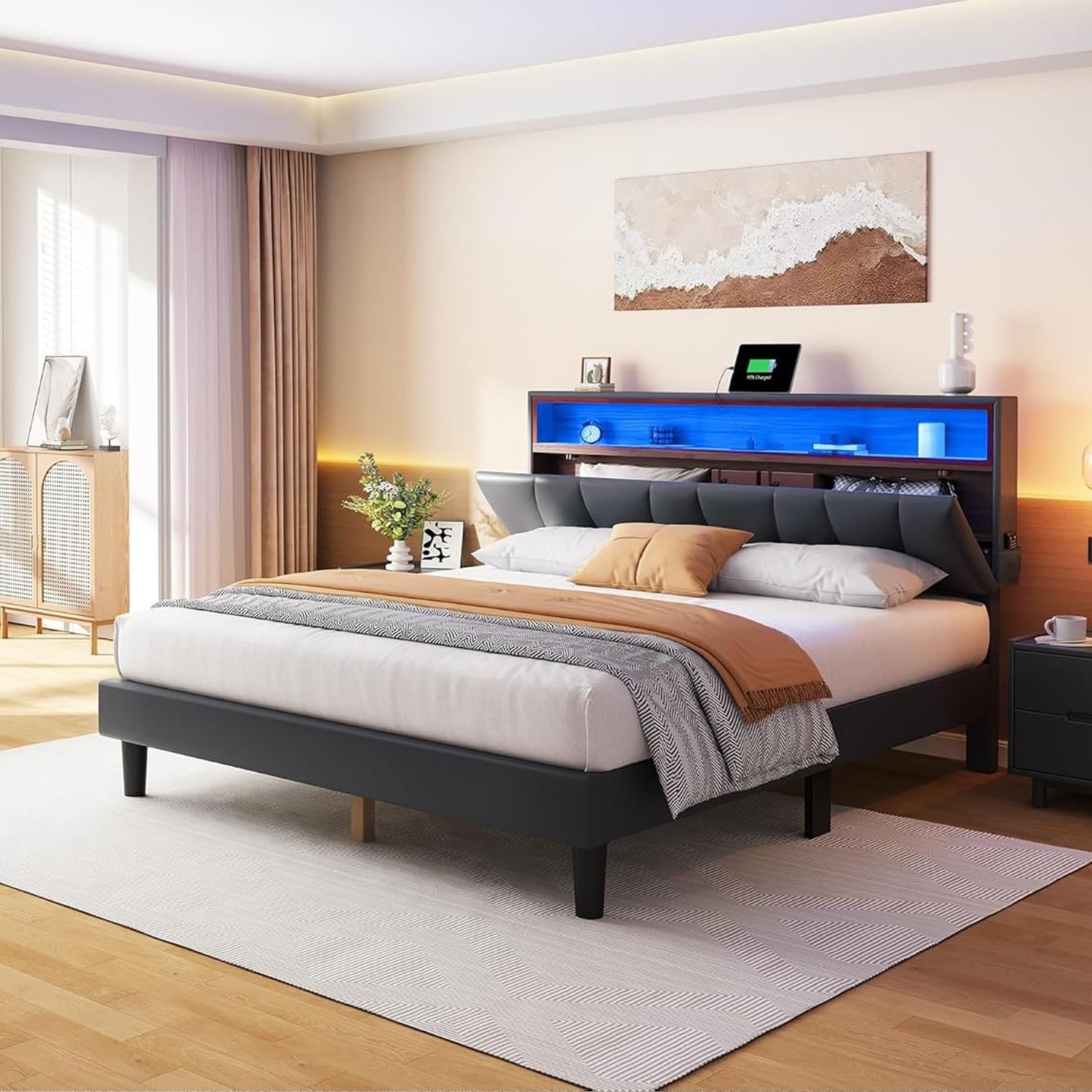 - Sophisticated Comfort: This upholstered bed frame king size features a headboard with built-in LED strip lights, enhancing your sleeping area with an air of sophistication and comfort; The soft headboard and wood enrich the overall design, offering an inviting, cozy atmosphere