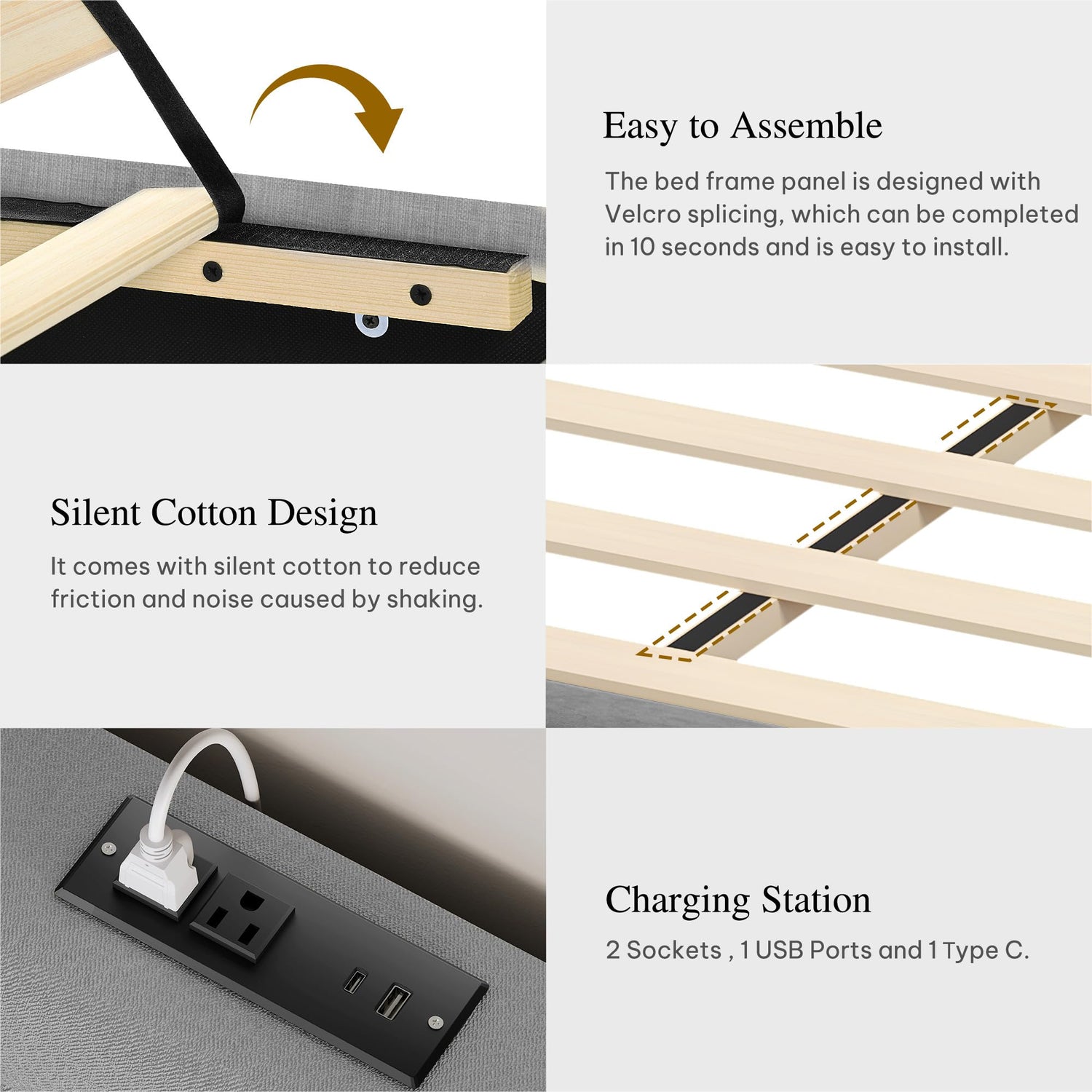 - Linen Upholstered Platform with Charging Station - The king size bed frame built-in charging station, including 2 AC sockets, 1 USB port, 1 Type-c charging a variety of electronic devices at your fingertips. Exquisite button-tufted headboards per-fect for a variety of bedroom styles. The linen fabric is breathable and gives you a skin-friendly feeling.