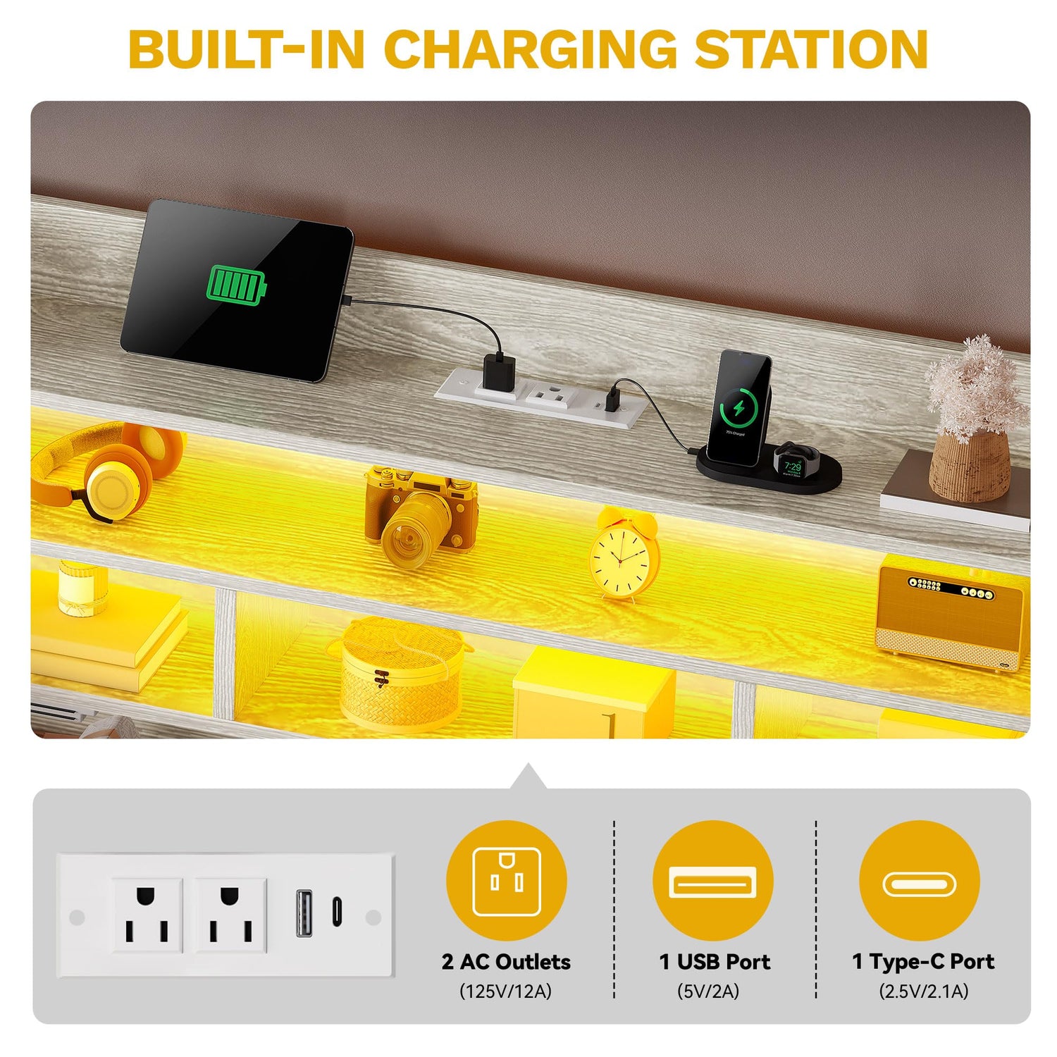 - Upholstered Platform with Charging Station - The king size bed frame built-in charging station, including 2 AC sockets, 1 USB port, 1 Type-c, charging a variety of electronic devices at your fingertips. Don't worry about running low, this charging station makes it easy to charge a tablet, phone or other mobile device.