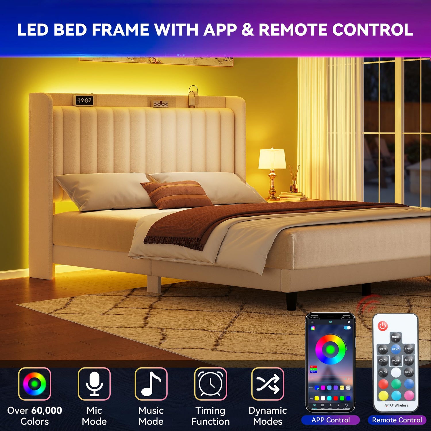 - Led Bed Frame With Rgb Lights: Equiped With APP & Remote Control, You Could Freely Switch Between Lightness,Speed and 29 Colors Dynamic Modes,You Could Customize Different Lighting Atmosphere as Your Demand by APP.