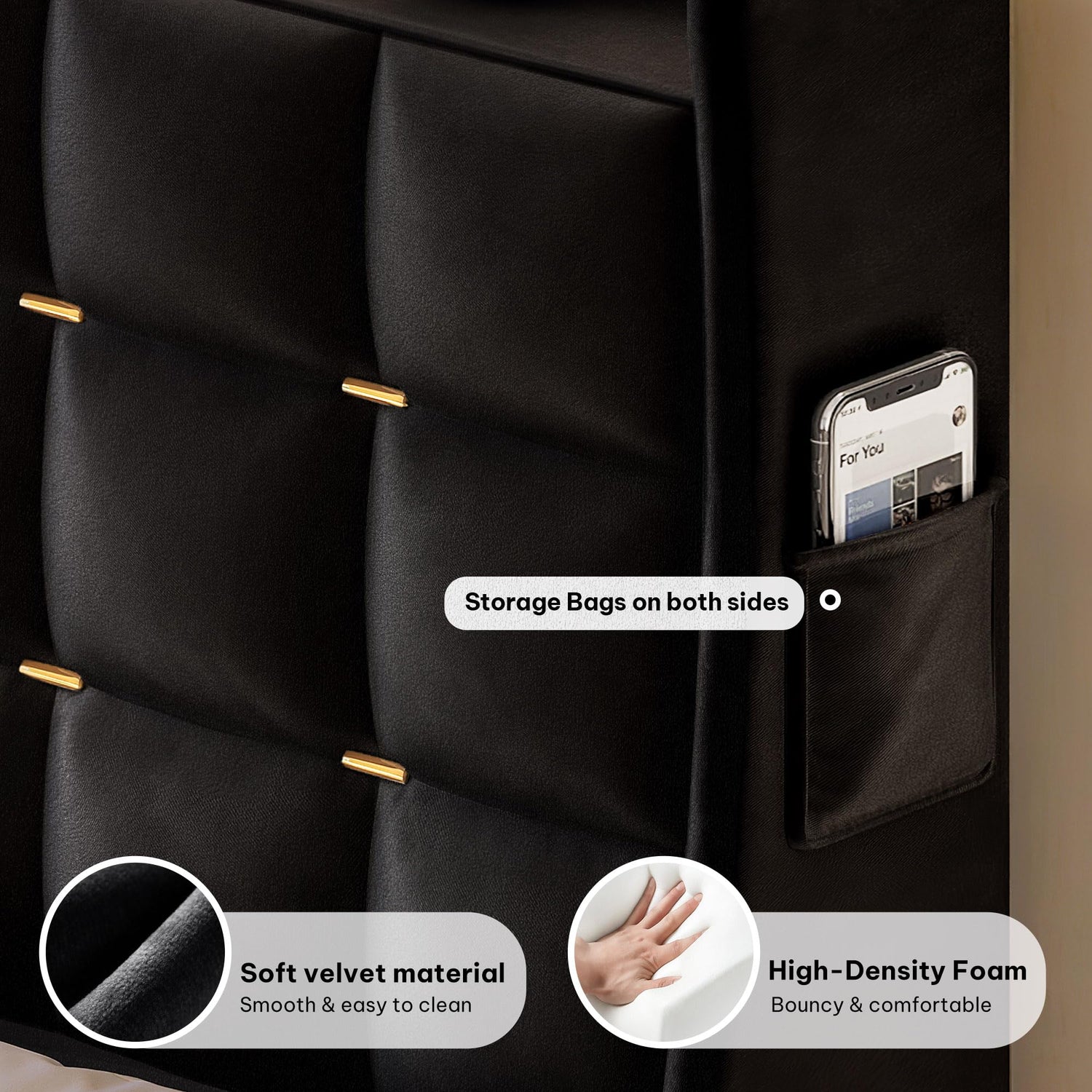 - Velvet Upholstered Platform with Charging Station - The Queen size bed frame built-in charging station, including 2 AC sockets, 2 USB port, charging a variety of electronic devices at your fingertips. Storage shelves on the top provide more storage space for frequently used items such as books, tissue boxes, or your favorite decorations.