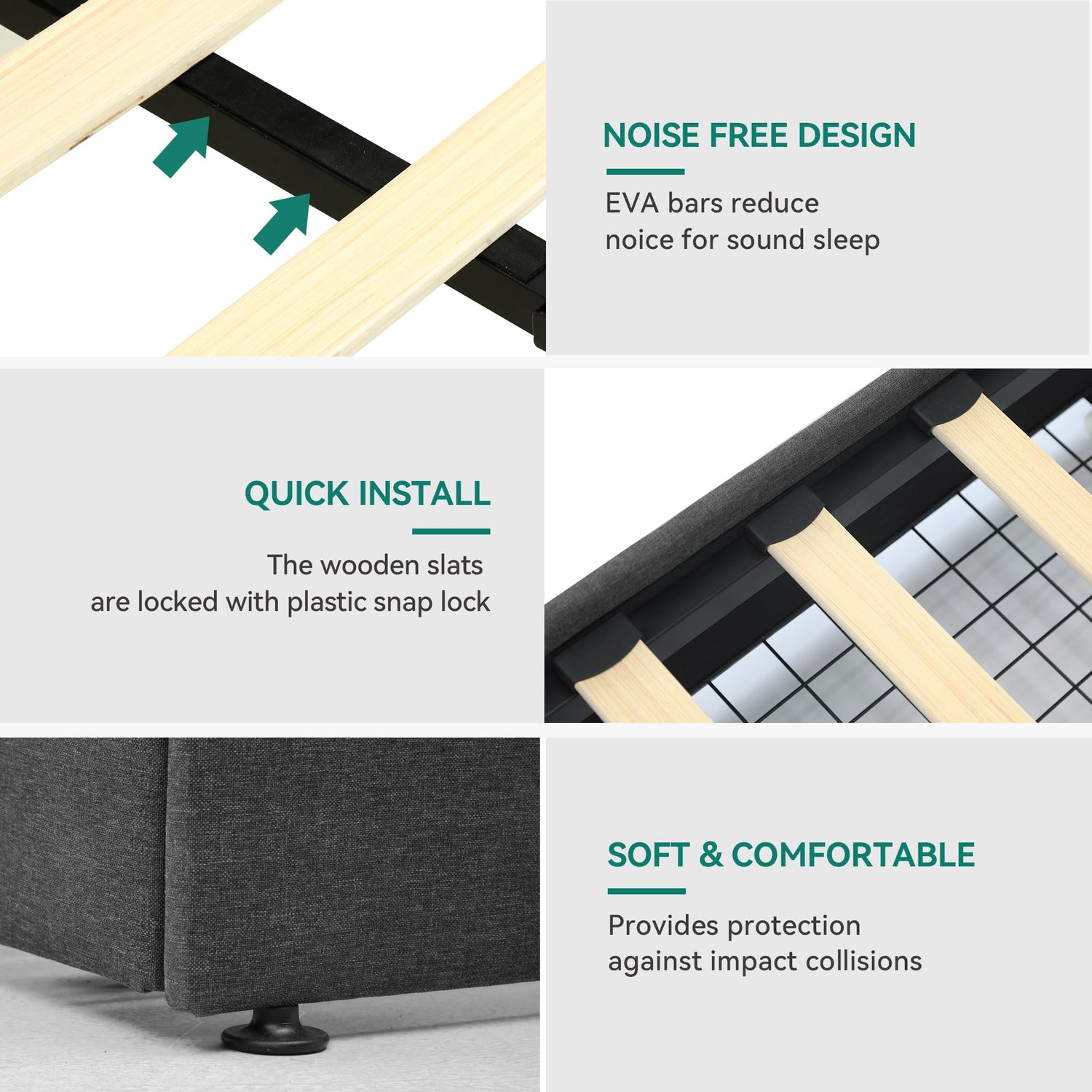 • Space-Saving Storage: Stay organized with our upholstered platform bed frame featuring 4 spacious drawers for convenient storage of clothing, blankets, bedding, etc. Each drawer sits on 4 wheels for smooth pulling in and out
