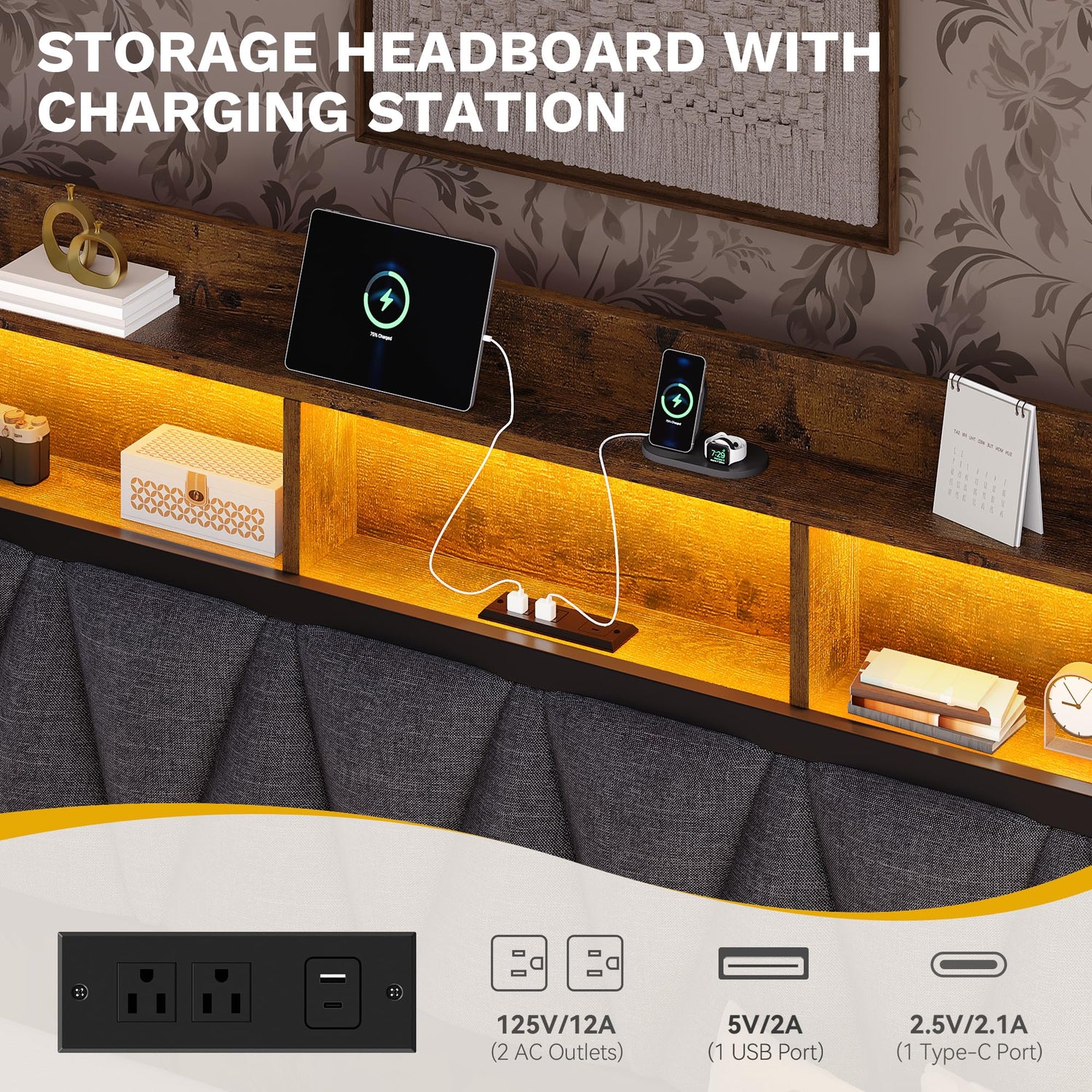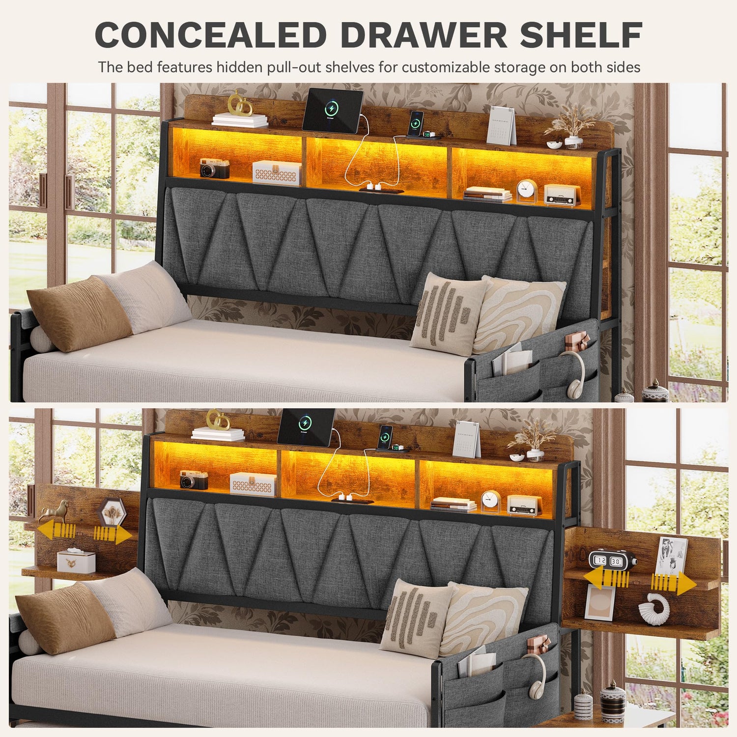 • Linen Upholstered with Charging Station - The RGB LED lights daybed built-in charging station, including 2 AC sockets, 2 USB port, charging a variety of electronic devices at your fingertips. Don't worry about running low, this charging station makes it easy to charge a tablet, phone or other mobile device.