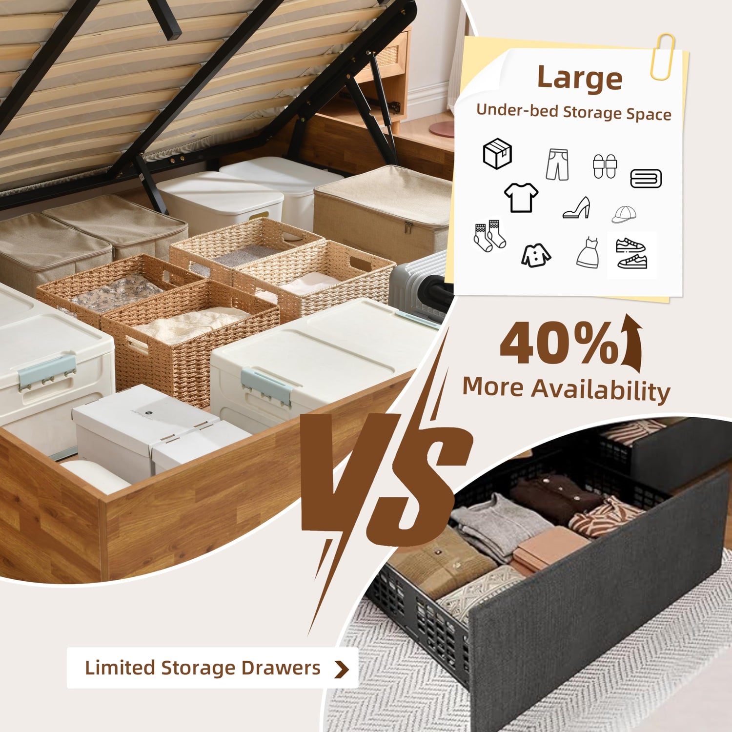 - Ample Storage Space: Our lift up storage bed king can be elevated up to 58 inches high, easily accommodating multiple storage bins, seasonal clothing, spare bedding, and even a 20-inch suitcase. Compared to traditional drawer storage, the vertical utilization rate is increased by up to 40%. It is particularly suitable for small apartments, dormitories, and compact bedrooms, making clutter disappear instantly and keeping the space tidy and organized
