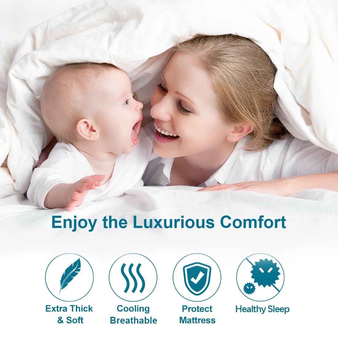 - 5.【Perfect Fit and Decent Present Idea】: The bed topper is equipped with a 360°all-around elastic skirt, perfectly fits and grips any mattress up to 21". So the mattress topper will be kept in place, no matter how you turn over on your bed at night. Ideal present for your family & friends on housewarming, Christmas, Thanksgiving, Valentine’s Day, New Year, etc.