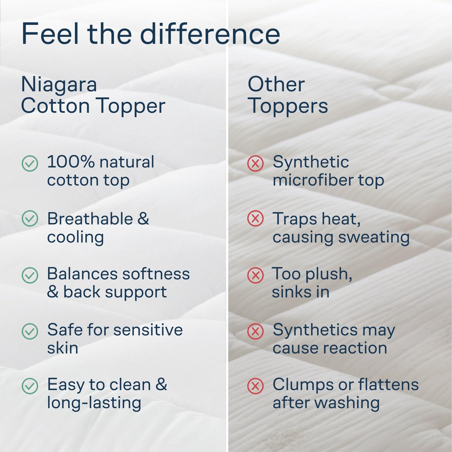 - ULTRA SOFT: The Niagara down mattress topper king is made from cotton on top and fits mattresses 8-20 inches deep. The king size thick mattress topper is gentle on sensitive skin, elastic, and ultra-soft.
