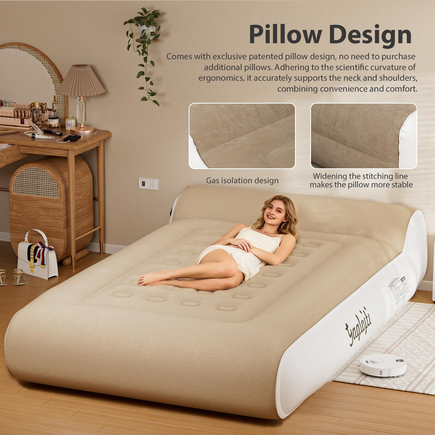 Gaglojti 16" Queen Air Mattress Full with Built in Pump for Camping,Portable Blow up Mattress with Carry Bag,High-Speed Pump,Luxury Inflatable Mattress Comfort Flocked Airbed for Guest,Home(Khaki)