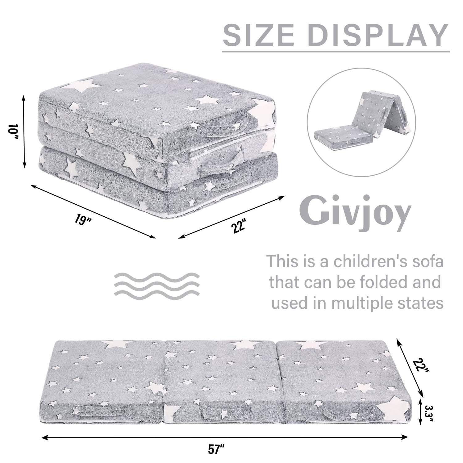 Givjoy Foldable Floor Mattress for Kids, Glow in The Dark Toddler Washable Tri Folding Floor Nap Mat for Sleeping Daycare, Child Trifold Futon Sofa Bed with Storage Bag for Girls and Boys