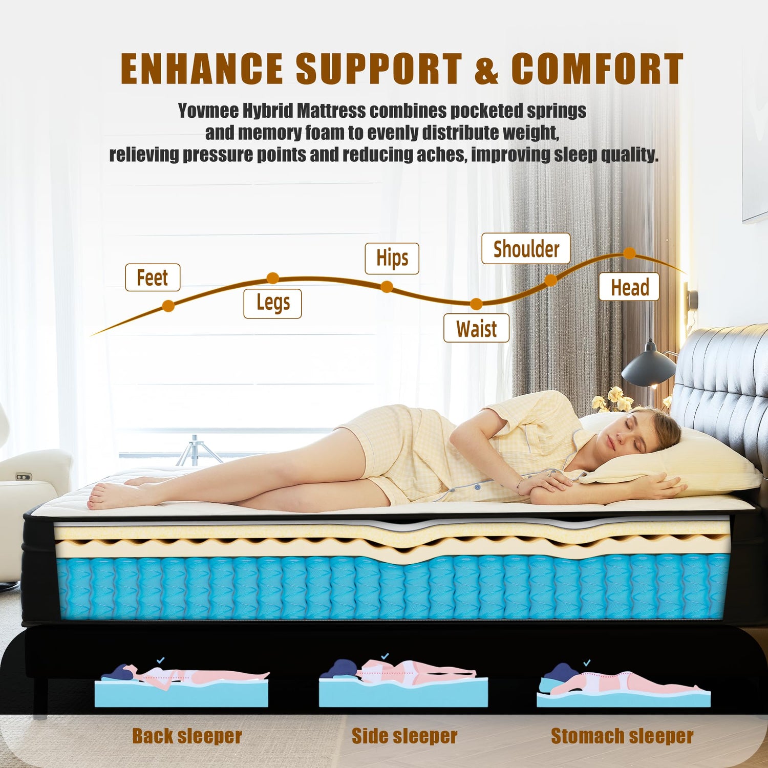 - ✅ Hybrid Mattress for Everyday Comfort and Full-Body Recovery - Rediscover what restful sleep feels like with the Yovmee hybrid mattress. Thoughtfully designed with responsive gel memory foam and individual pocket springs, this mattress offers a perfectly balanced medium firm feel that adapts to your body while supporting proper spinal alignment. The combination of foam and springs ensures deep pressure relief and reduces tossing and turning, so whether you’re winding down from a long day or catching up after a restless week, this mattress helps you fall asleep faster, stay asleep longer, and wake up refreshed—every single morning.