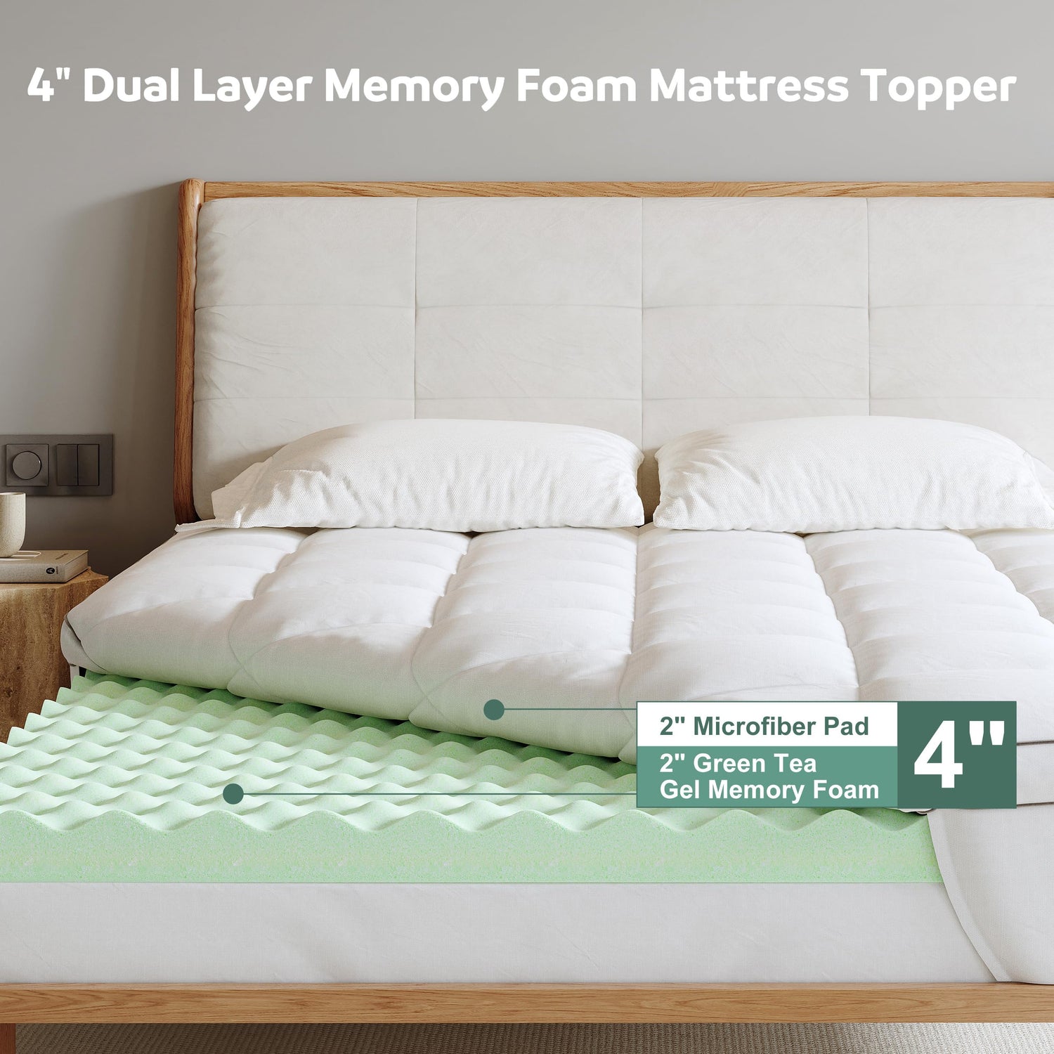 Lazyzizi Memory Foam Mattress Topper Queen, 4inch Dual Layer Cooling 2''Gel Green Tea Memory Foam & 2" Pillow Top Mattress Pad, 8-21inch Deep Pocket, Egg Crate for Back Pain Relief