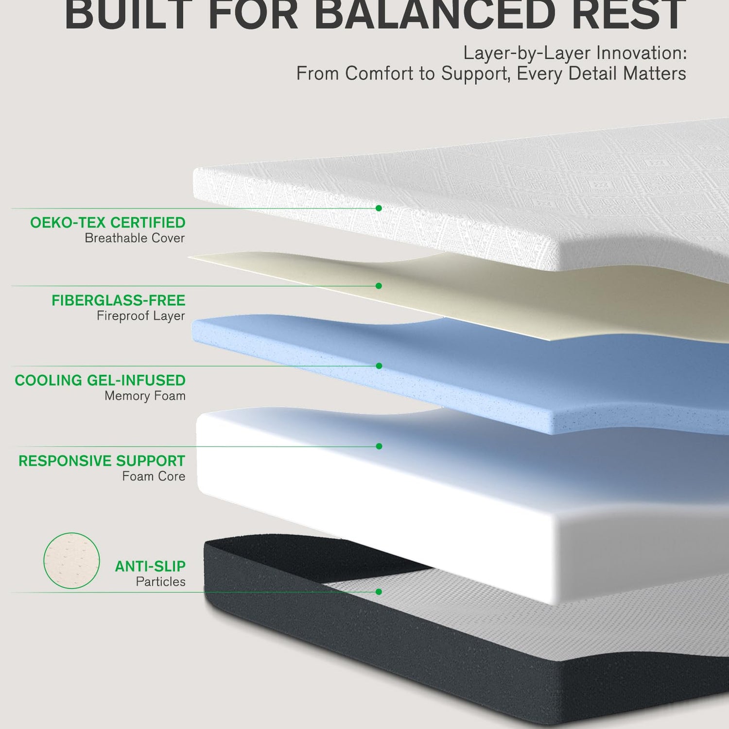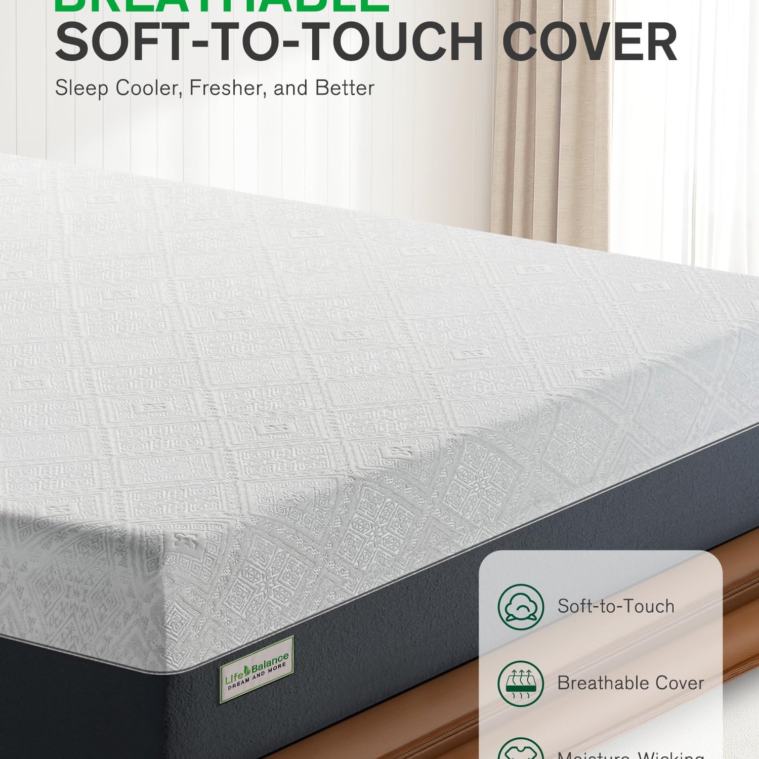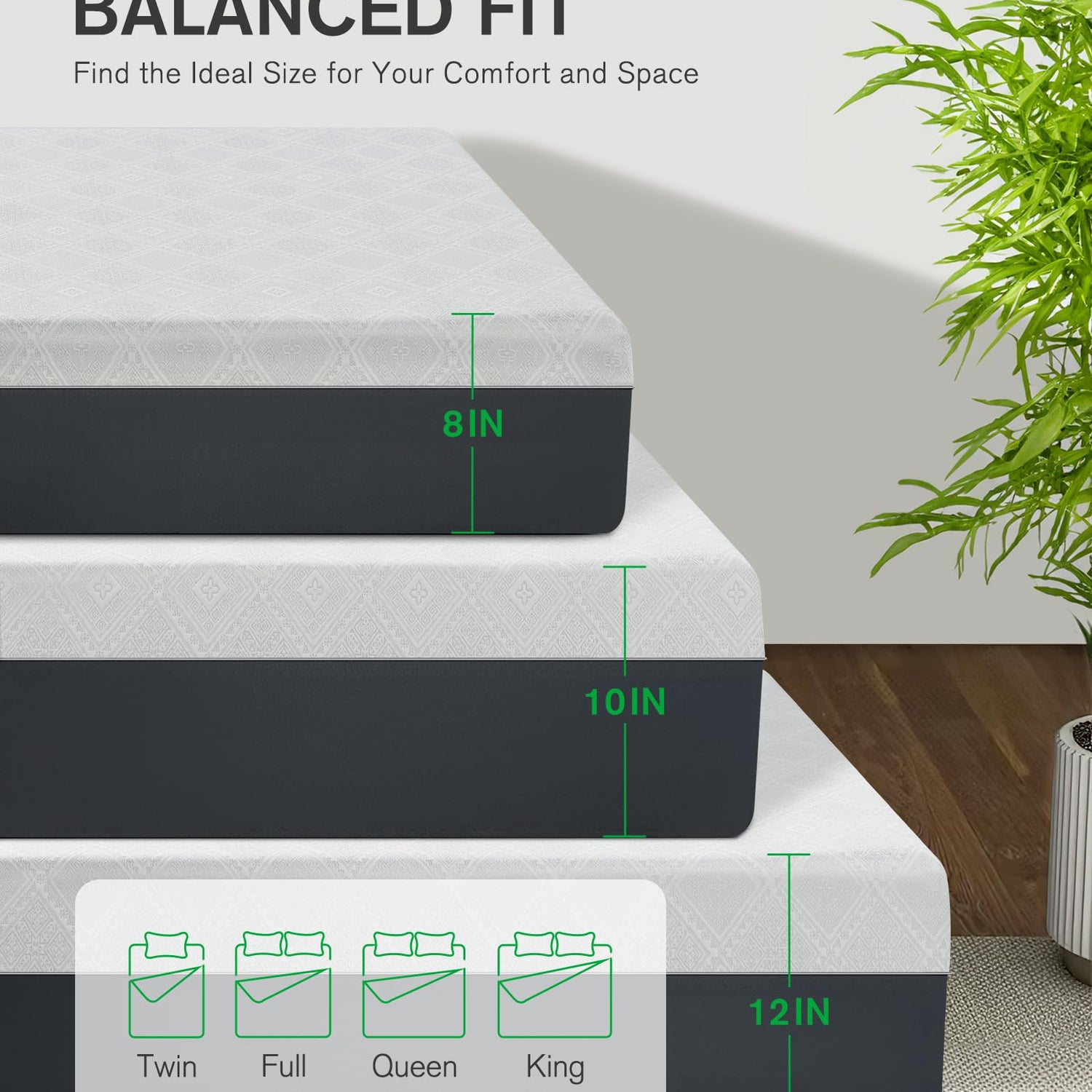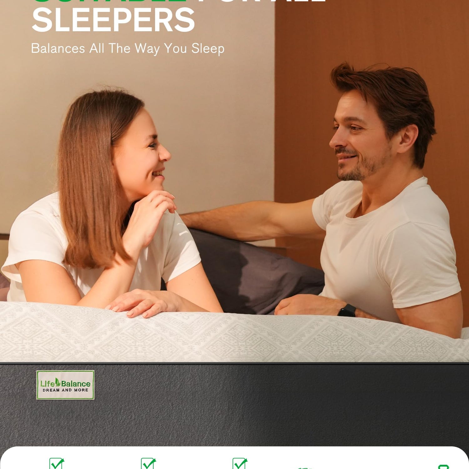 - 【Balanced Comfort for Every Sleeping Position】This Life Balance mattres offers customized comfort and support for every sleep position—whether you sleep on your back, side, or stomach. Compatible with all bed frames, including adjustable bed frame, it’s available in four standard U.S. sizes and three thickness options: 8”, 10”, and 12”. Delivered compactly in a bed-in-a-box, it ensures effortless setup and great value for every type of sleeper.